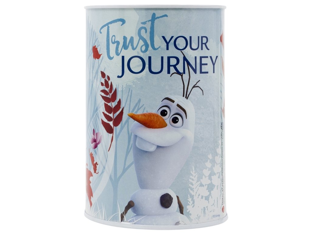 Barevná kovová pokladnička s grafikou sester Elsy a Anny a sněhuláka Olafa v zimním období ze filmové pohádky Frozen. Pokladnička je vhodná pro každého menšího i většího fanouška, který si chce našetřit nějaké ty peníze.
