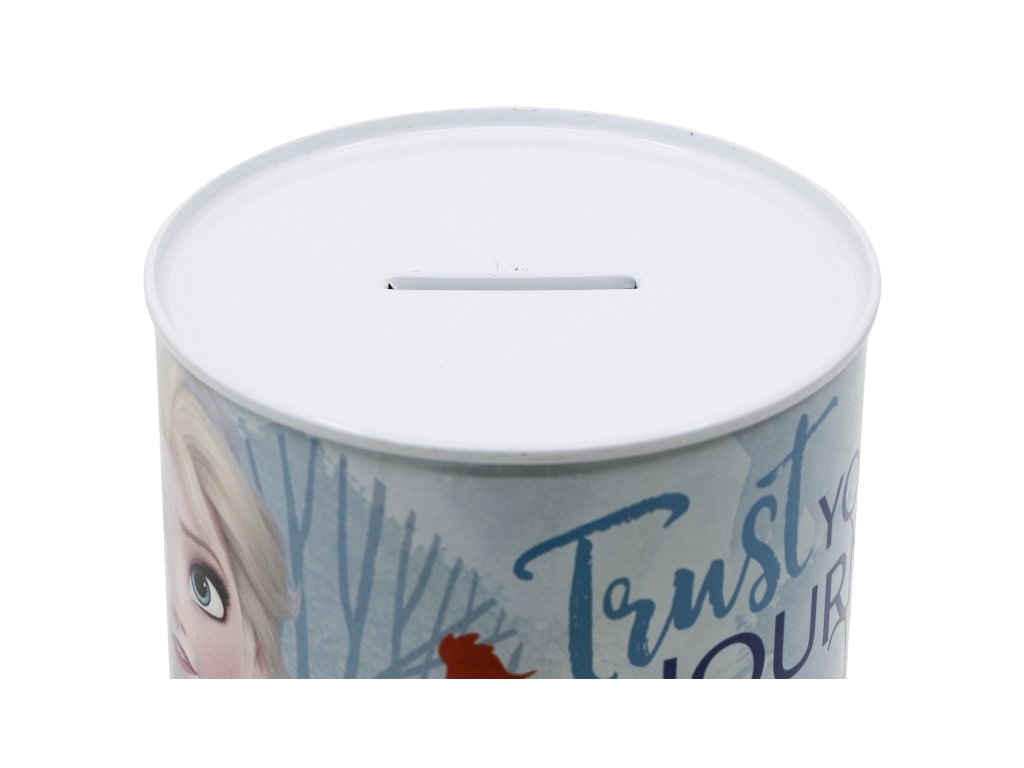 Oficiální produkt, kovová pokladnička z katalogu výrobků s licencí a grafikou populární filmové pohádky Frozen.