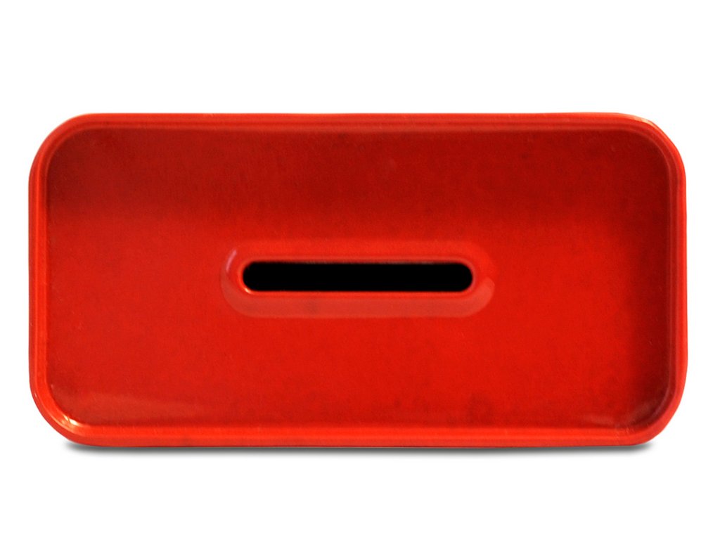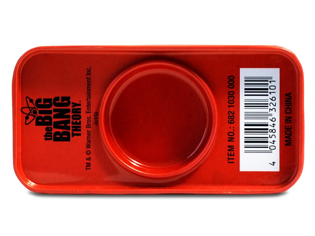Červená kovová pokladnička s grafikou seriálu Teorie velkého třesku a nápisem Bazinga.