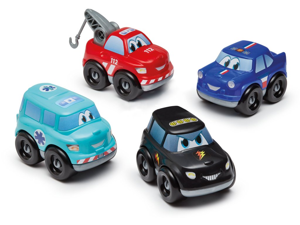 Sada autíček s očíčky z řady Abrick obsahuje odtahovku, hasičské auto, policejní auto a "zlodějské" auto. Délka auta 10 cm.