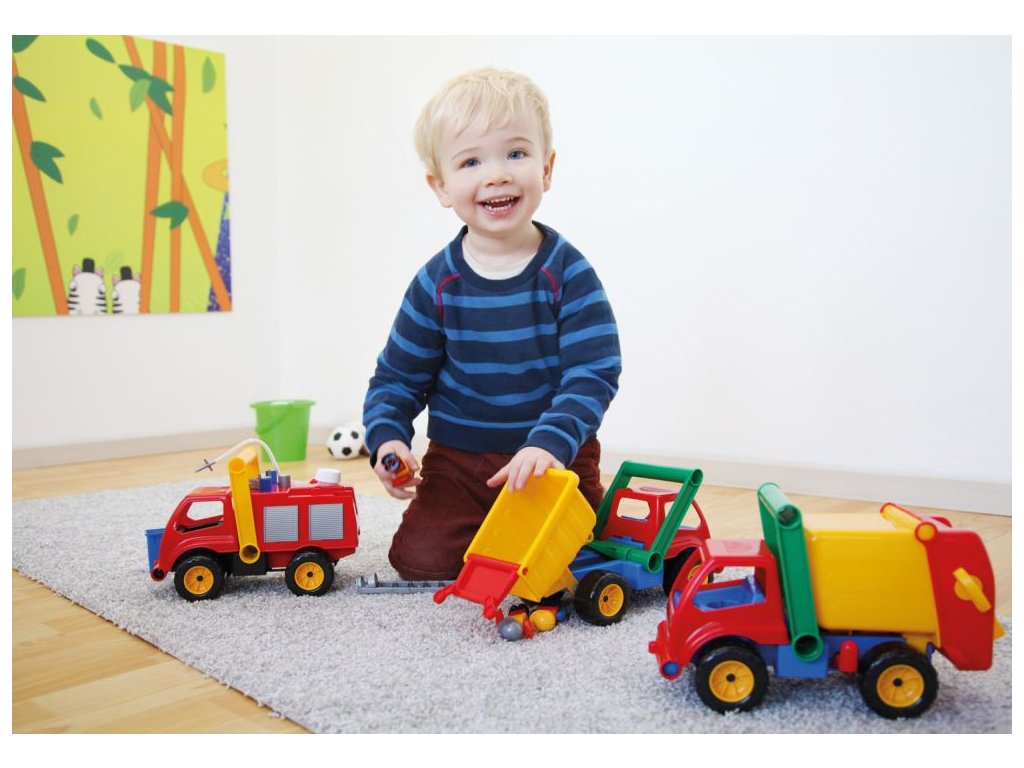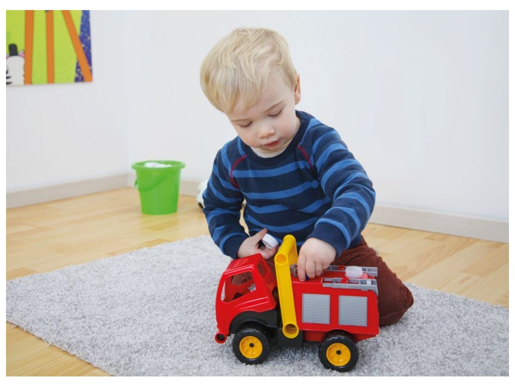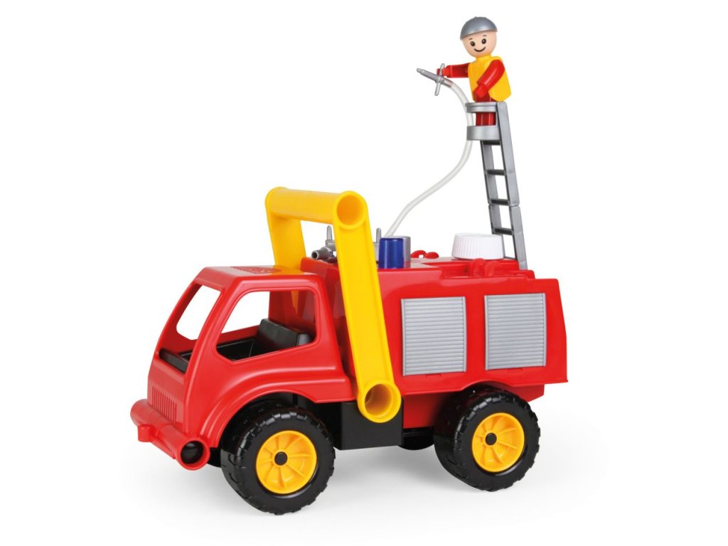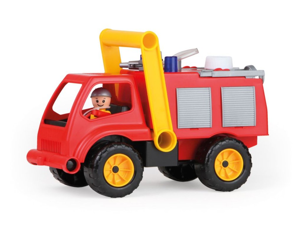 Aktivní hasič z kvalitního plastu a velmi pevnou stavbou. Je plně mechanicky funkční. Osahuje nádobku na vodu s mechanickou pumpou k vodnímu dělu a odklopitelnou kabinu s panáčkem. Délka cca 30 cm. Vhodné pro kluky od 3 let.