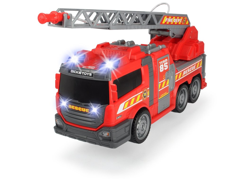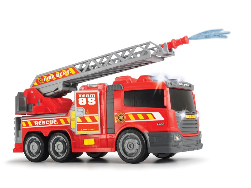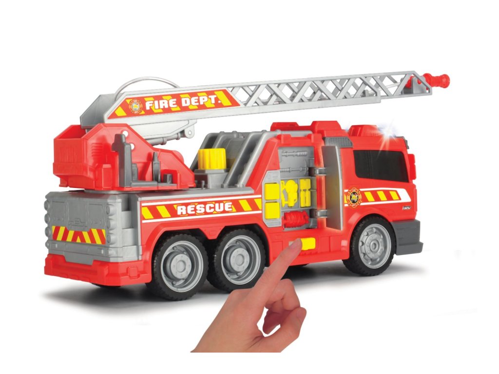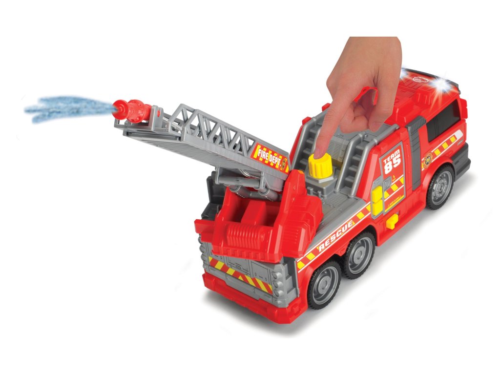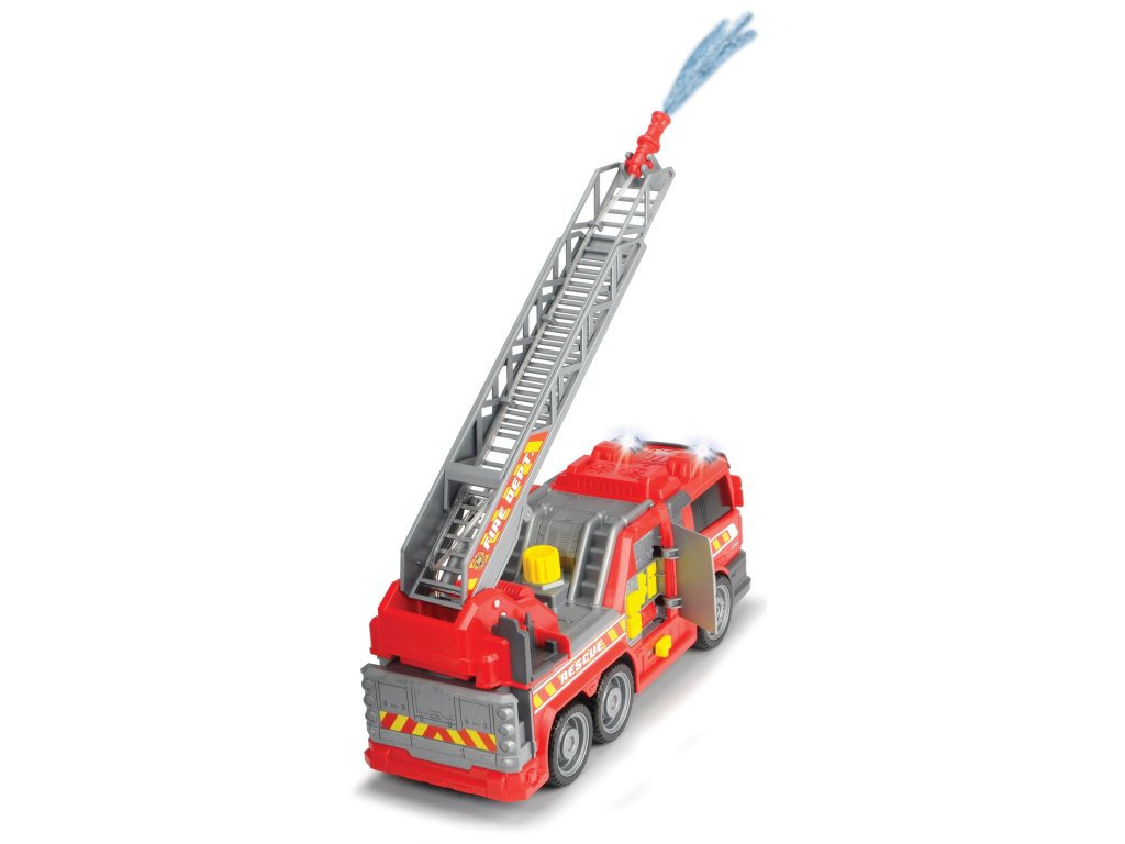 Hasičské auto se žebříkem na volnoběh. Se zvukovými a světelnými efekty, s funkční stříkačkou na manuální ovládání a s otevíracím bočním panelem. Délka 36 cm.