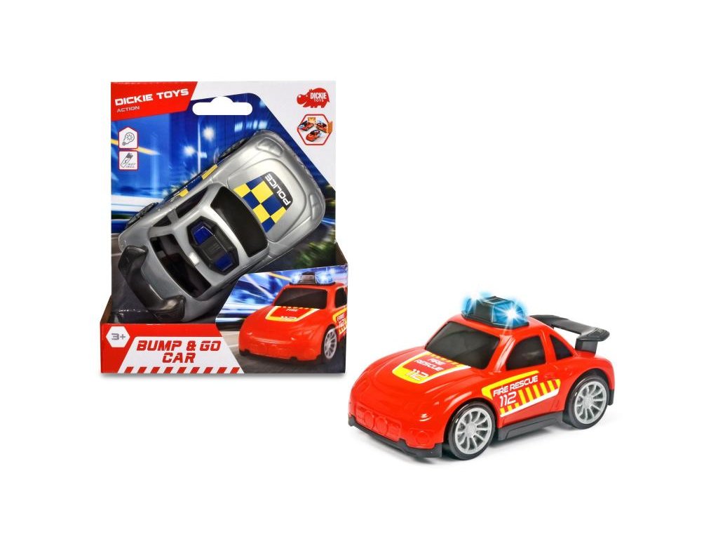 Autíčko na baterie na volněh. Při nárazu do překážky se automaticky otočí a jede jinam. Světelný efekt. Délka 12 cm. 2 druhy - policie nebo hasiči.