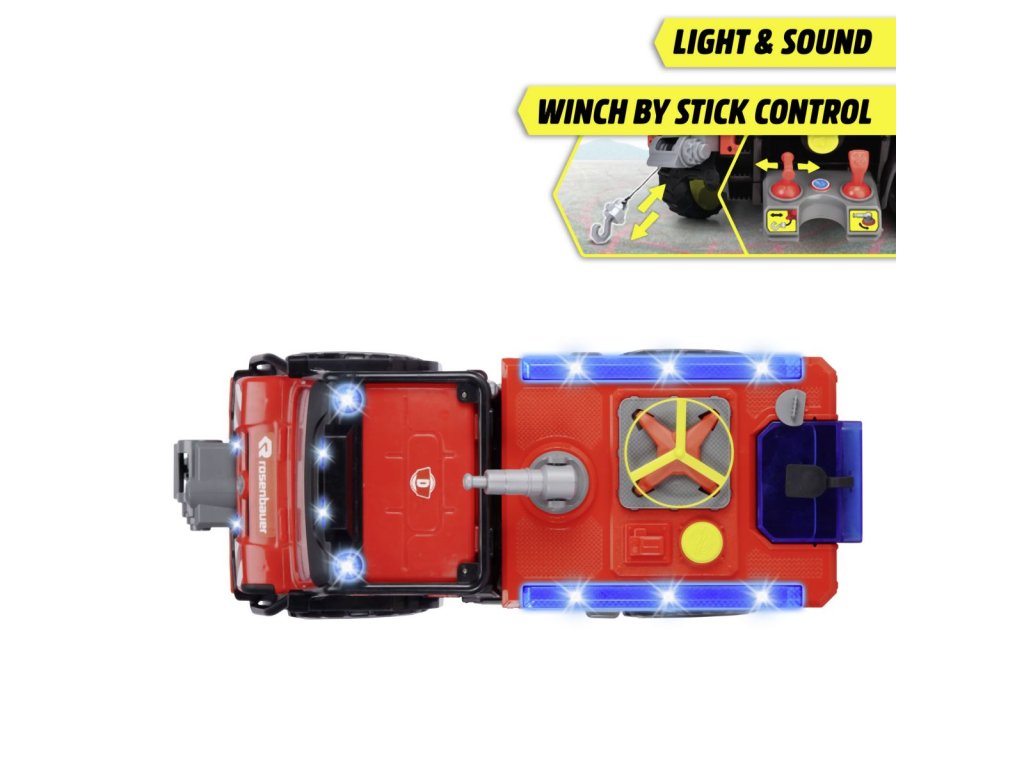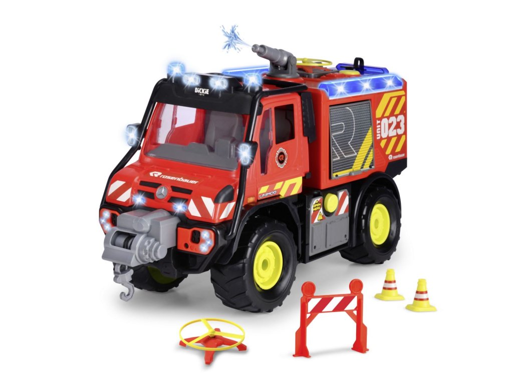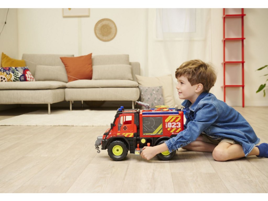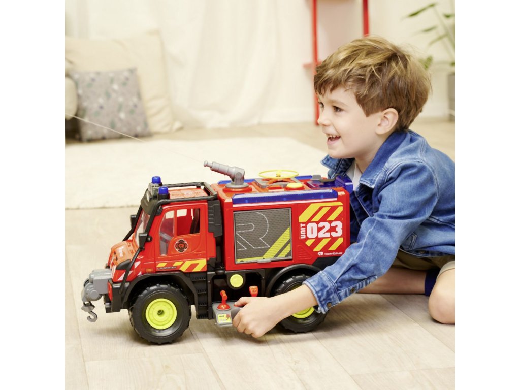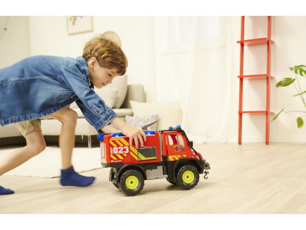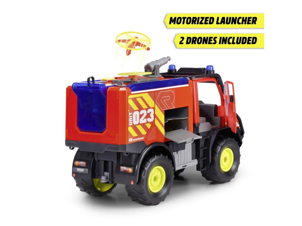 Hasičské záchranné auto Mercedes-Benz Unimog U530 na volnoběh. Má světelný a zvukový efekt, naviják ovládaný baterií, vodní pistole na stříkání vody ovládaná páčkou. Otevírací dveře, výkyvné nápravy. Součástí jsou dva drony se spouštěcí rampou ovládanou baterií. Délka auta 50 cm. Barva červená.