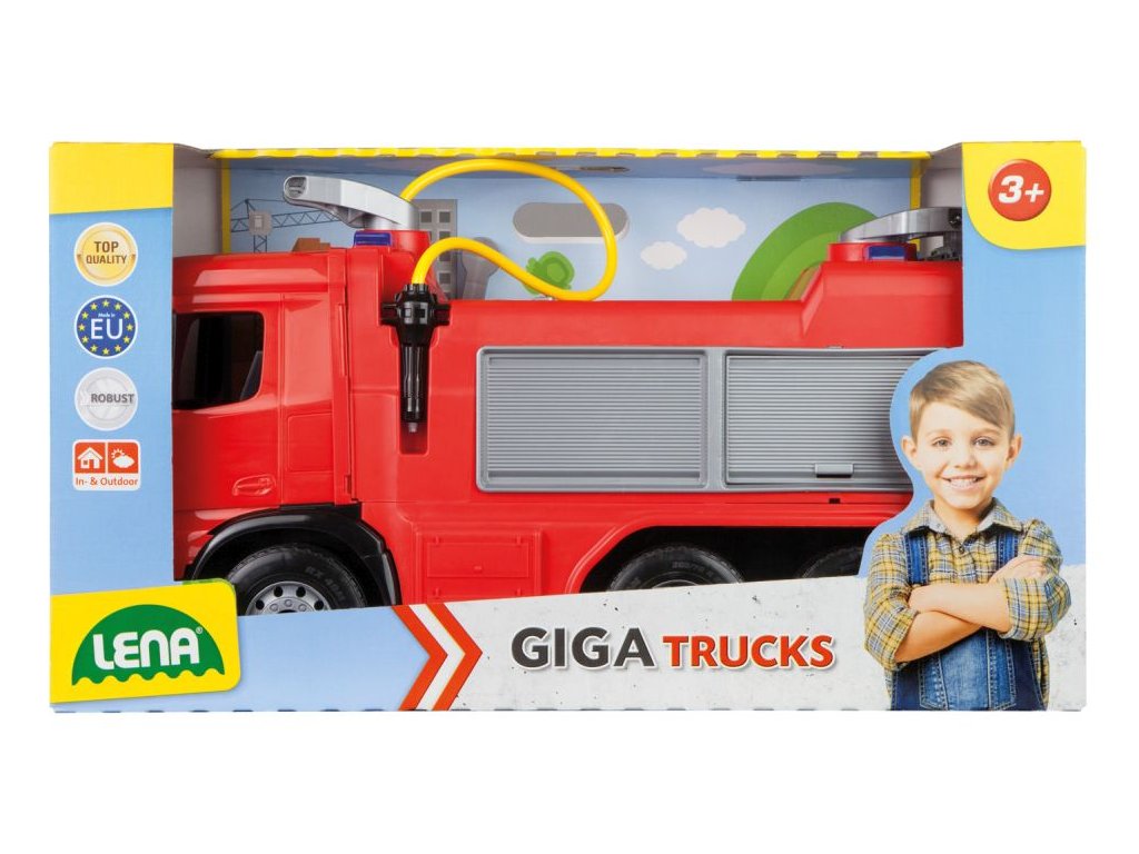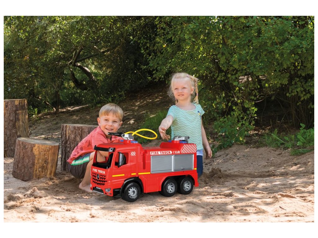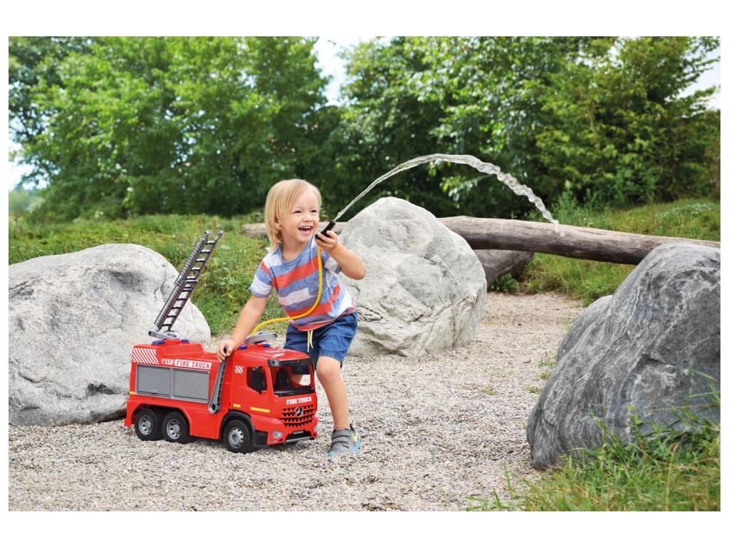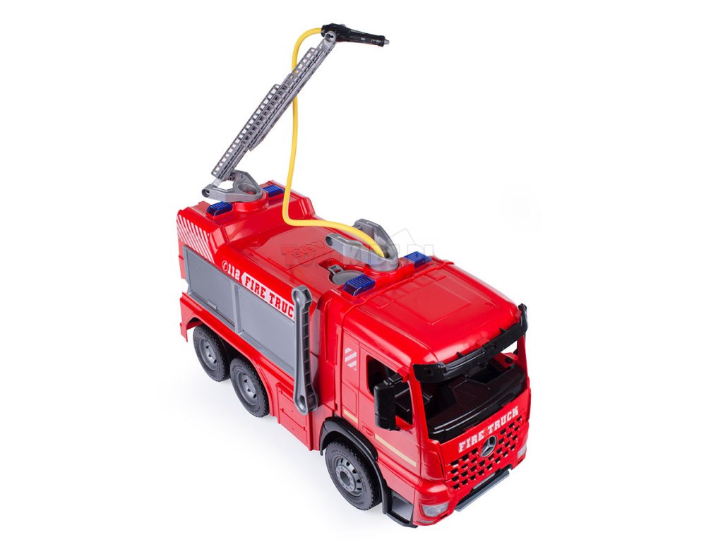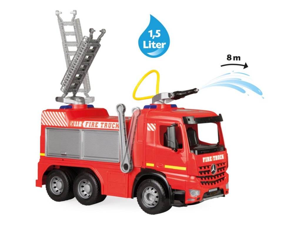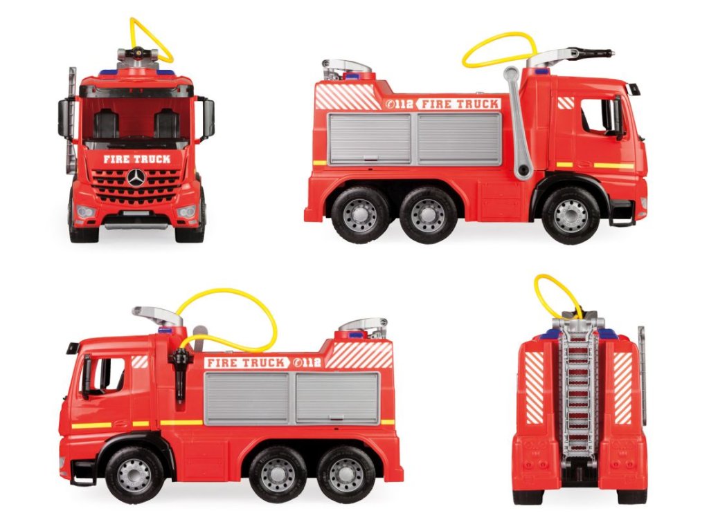 Mercedes požární auto s plně funkčním vodním dělem, velikost nádržky na vodu 1,5 litru, dostřik vody až 8metrů, výsuvný žebřík. Velikost 66cm. Vyrobeno v ČR