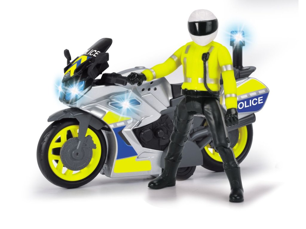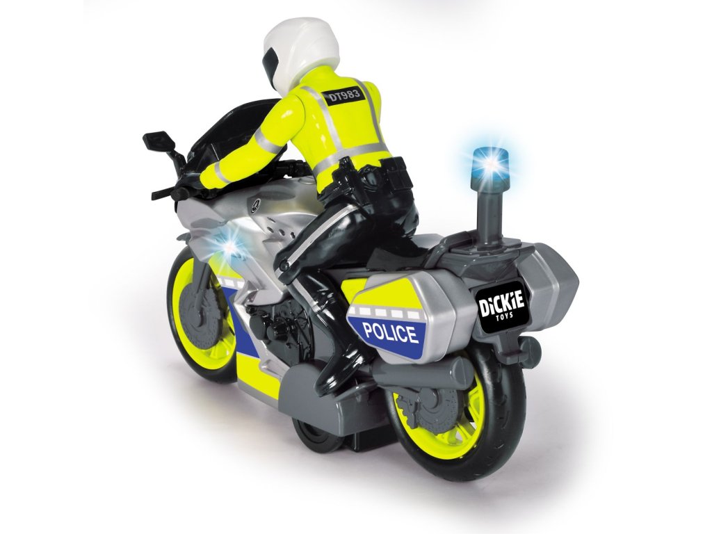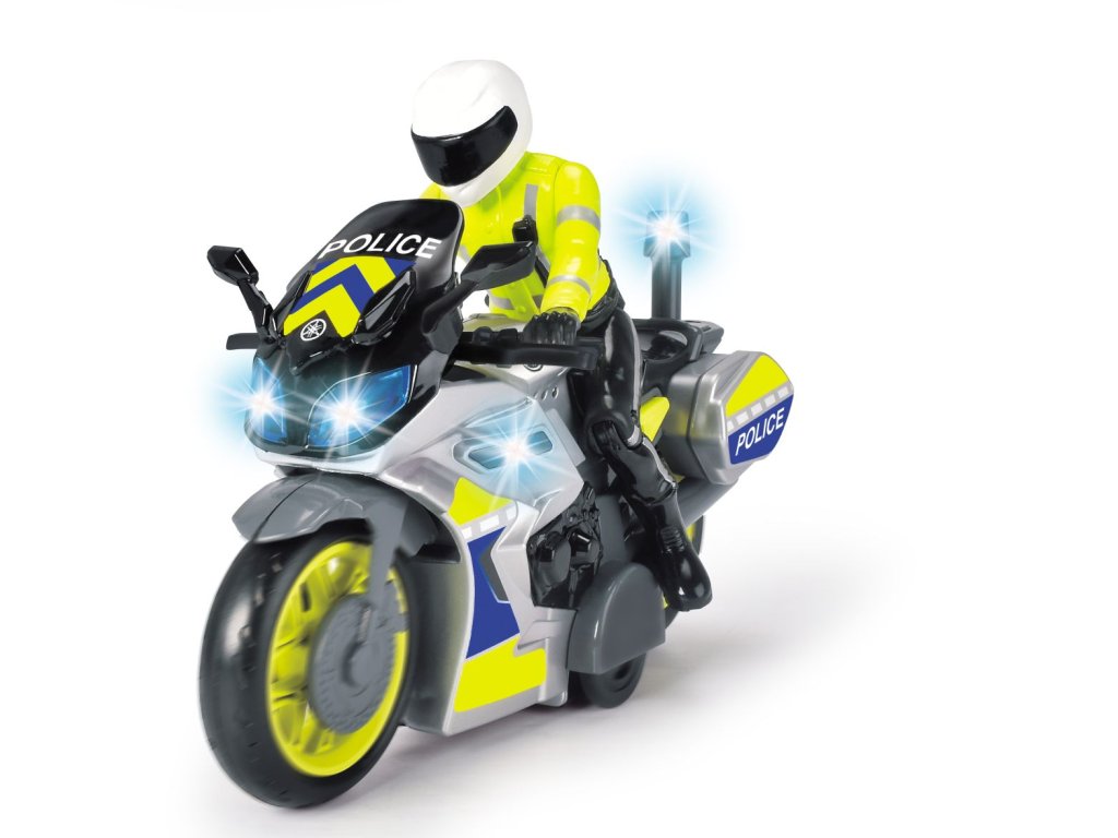 Motorka Yamaha na setrvačník, se světlem a zvukem, s pohyblivou figurkou řidiče. Délka 17 cm.