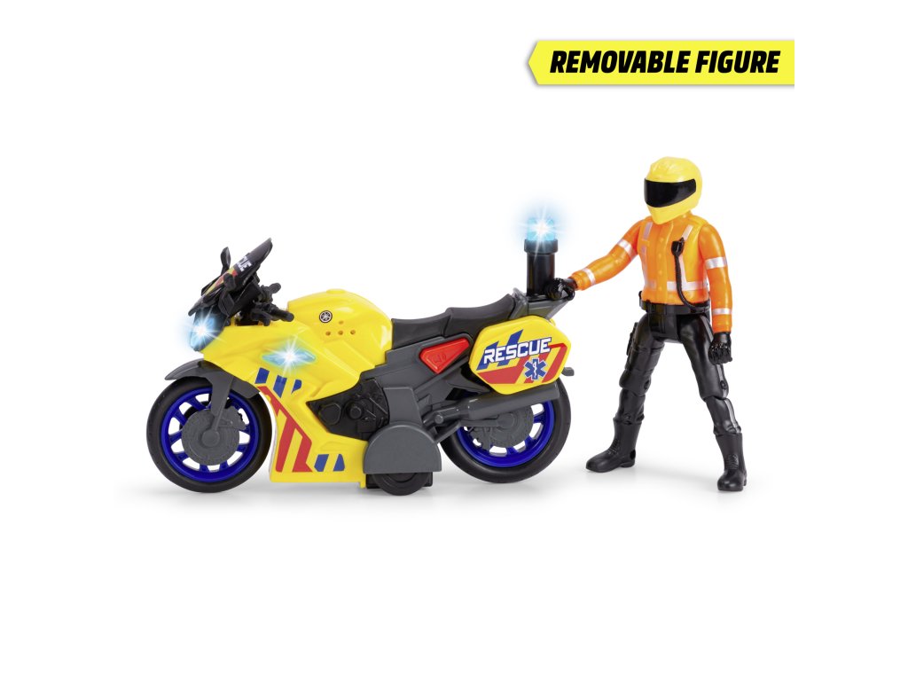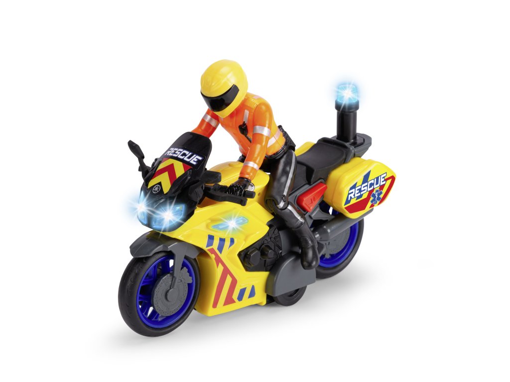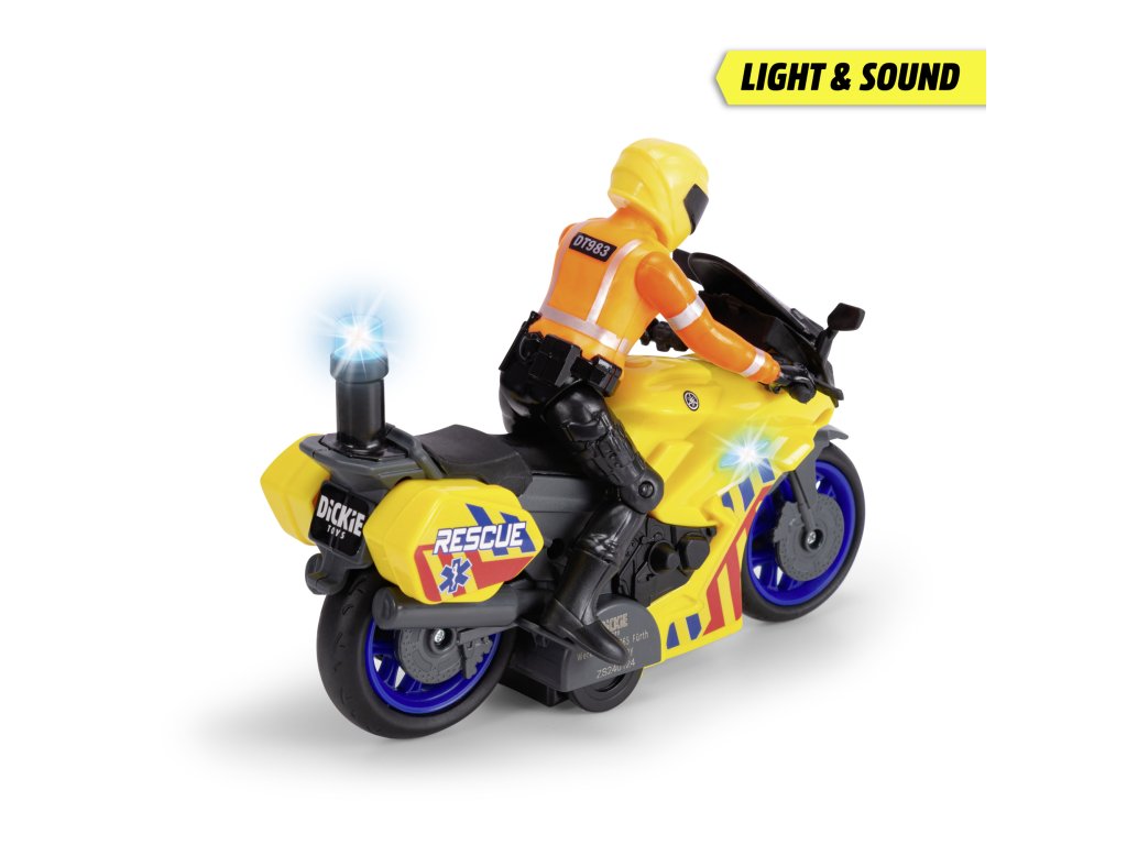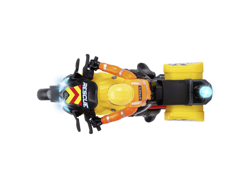 Motorka Yamaha na setrvačník, se světlem a zvukem, s pohyblivou figurkou řidiče. Délka 17 cm.