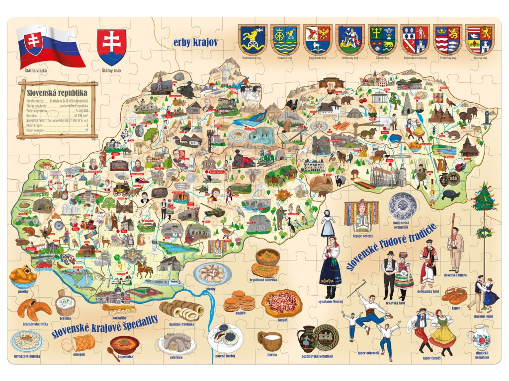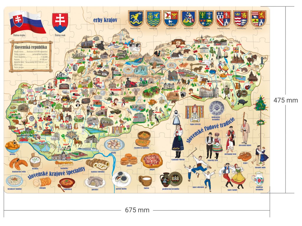 Milujete cestování a skládání puzzle? Pak je tato mapa Slovenské republiky přesně pro vás. Zeměpisné puzzle pro děti s mapou Slovenské republiky a ilustracemi v podobě místních památek a turisty vyhledávaných míst. Puzzle vám pomohou naučit se jaké pamětihodnosti, stavby či přírodní útvary zde naleznou. Obrázky od českého výtvarníka. Počet dílků: 160 ks. Rozměr výrobku: 67,5x 47,5 cm. Rozměr balení: 31x22,5x7 cm. Věk: 3+