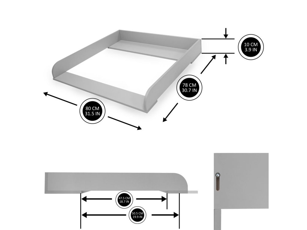 Dřevěný přebalovací nástavec. Snadná montáž a rozložení. Přední deska tohoto přebalovacího pultu je flexibilní a lze ji posouvat až o 4 cm. Rozměry: 80 (š) x 78 (h) x 10 (v) cmVhodné pro položky IKEA:1. Nordli (hloubka 47 cm)2. Malm (hloubka 48 cm)3. Hemnes (hloubka 50 cm)