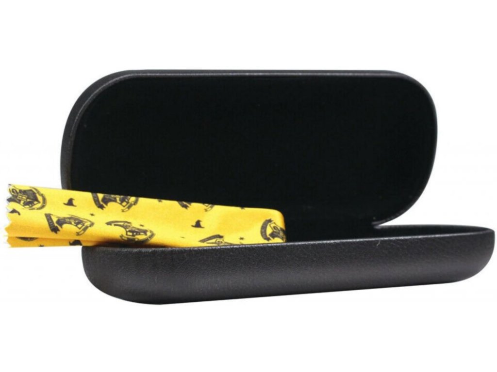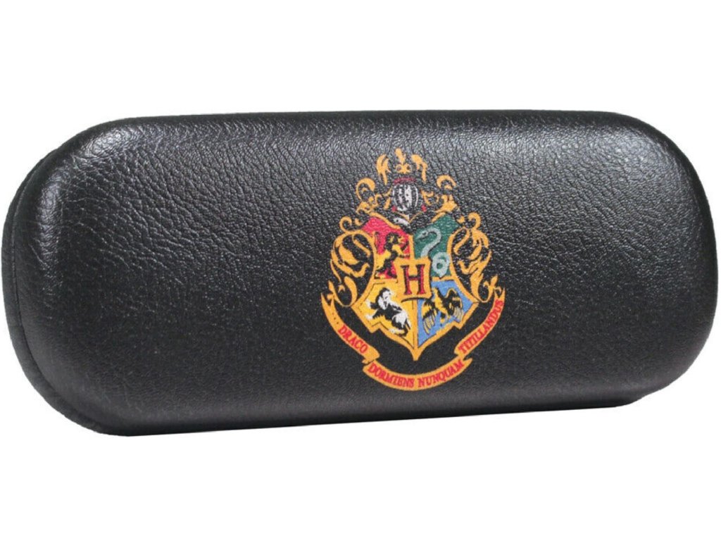 Černé pouzdro na brýle se znakem a grafikou školy Bradavic, ze slavné filmové sci-fi ságy Harry Potter.