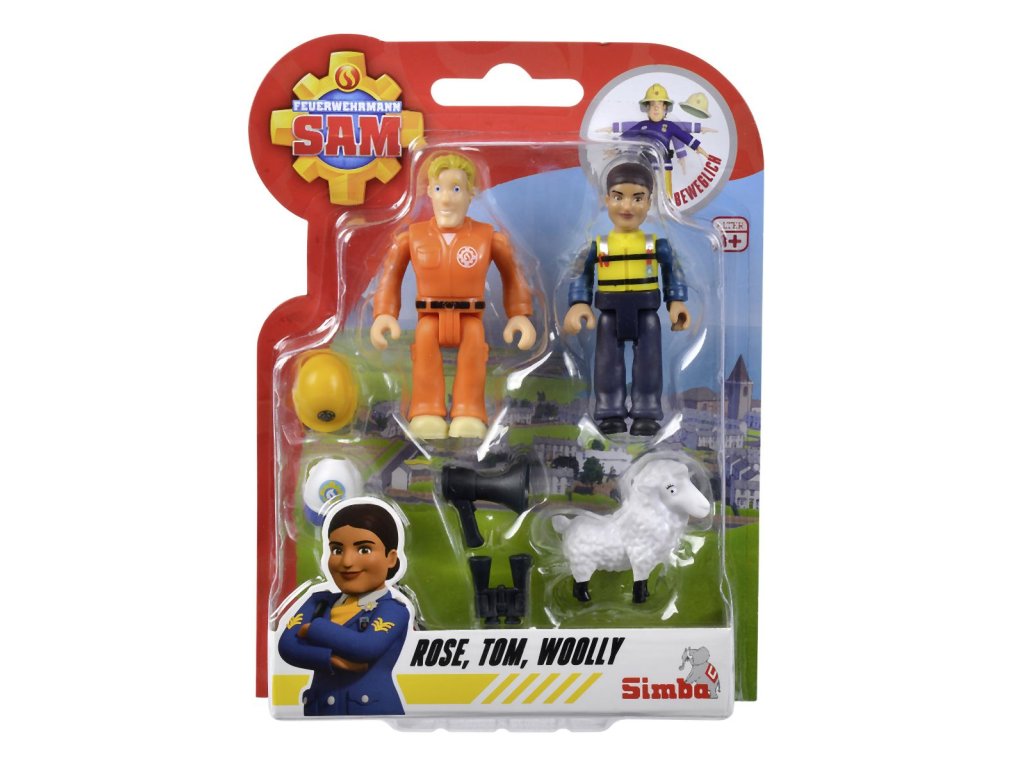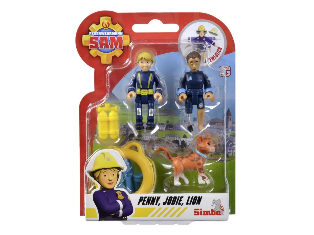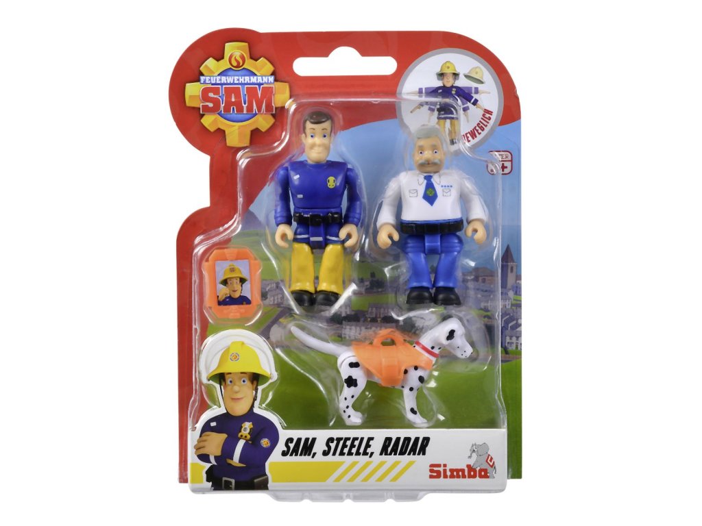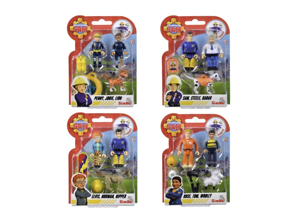 Sada figurek a zvířátka ze seriálu Požárník Sam. 4 druhy: Sam, Steele a pes Radar; Penny, Jodie a kočka Lion; Norman, Elvis a pes Nipper; Rose, Thomas a ovečka Wooly. Figurky mají pohyblivé končetiny, doplňky. Výška 7,5 cm.