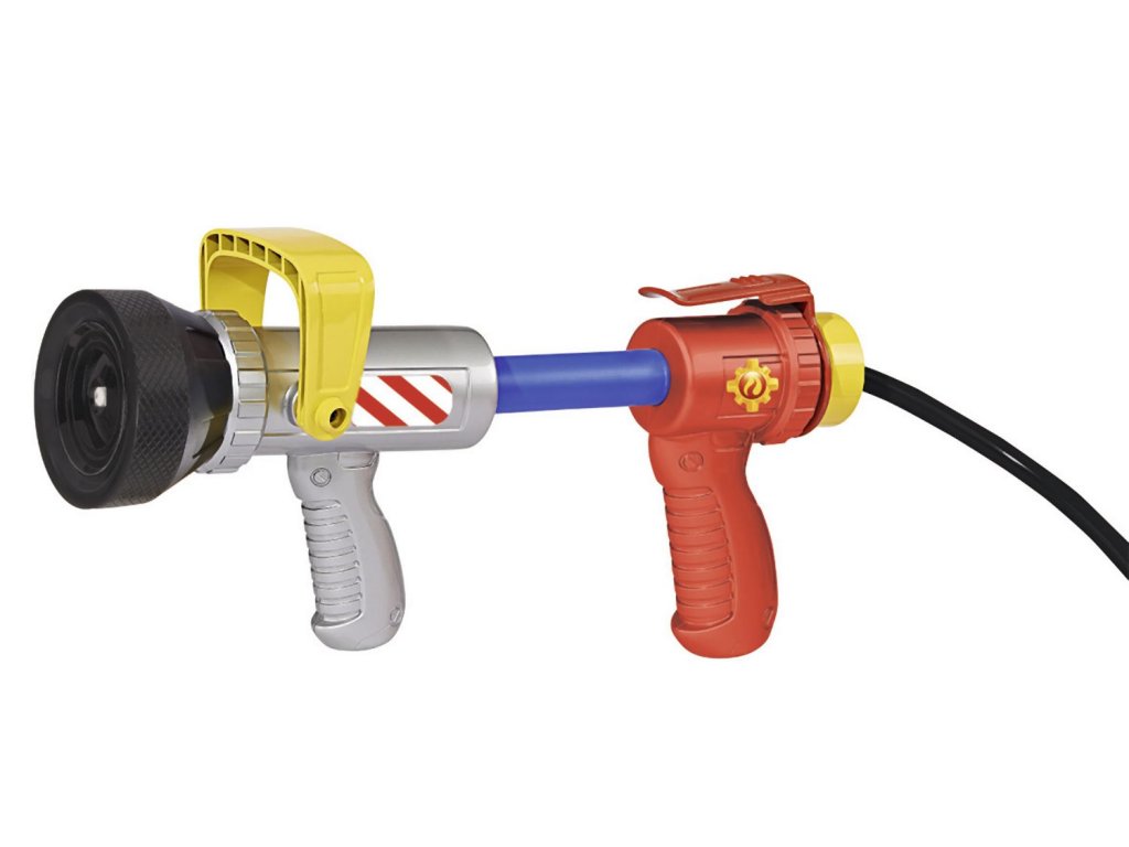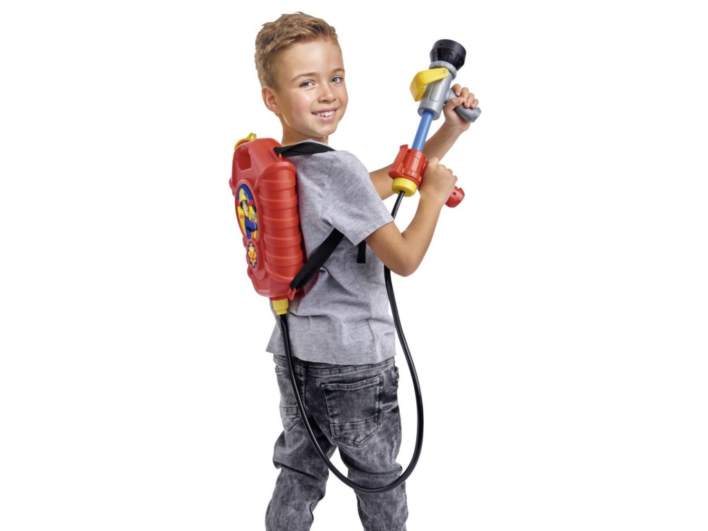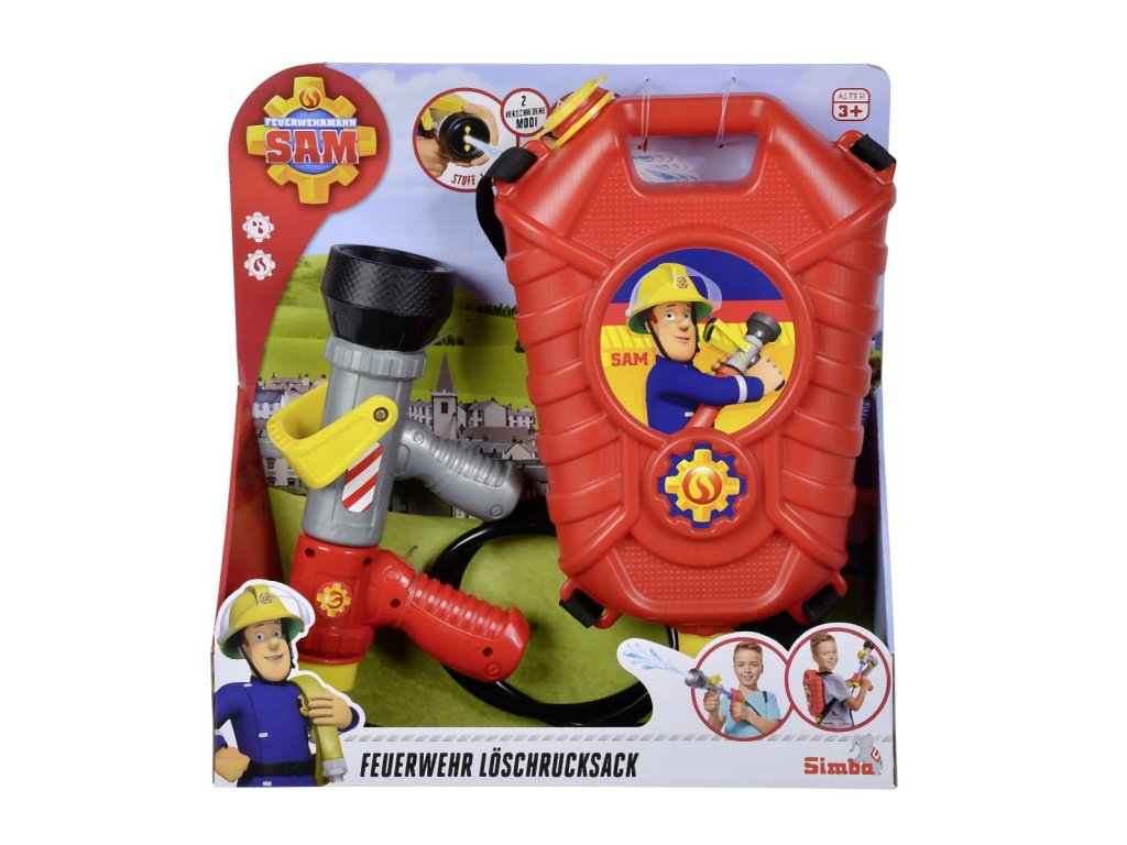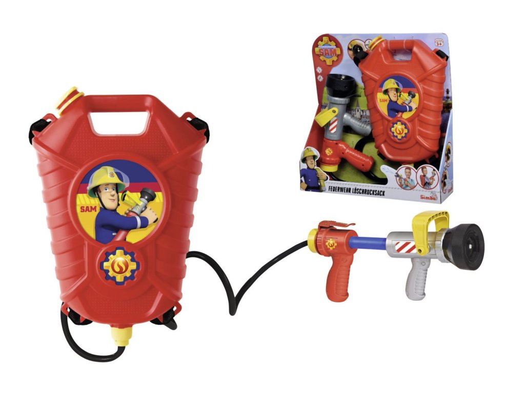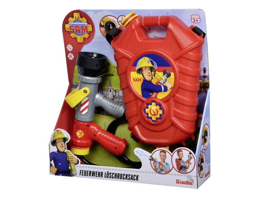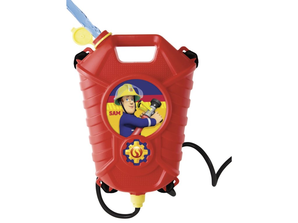 Hasicí sada na záda v licenci Požárník Sam s jednorázovým nebo vícenásobným prouděním vody. Zásobník na vodu 1800 ml. Velikost pistole 23 cm. Dosah až 10 m.