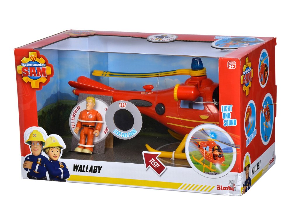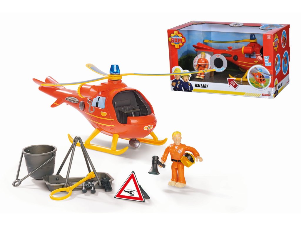 Vrtulník s figurkou Toma z oblíbeného seriálu Požárník Sam. Modrý světelný efekt, světlomet a zvukový efekt. Otočná vrtule, mechanický naviják a příslušenství. Délka 15 cm