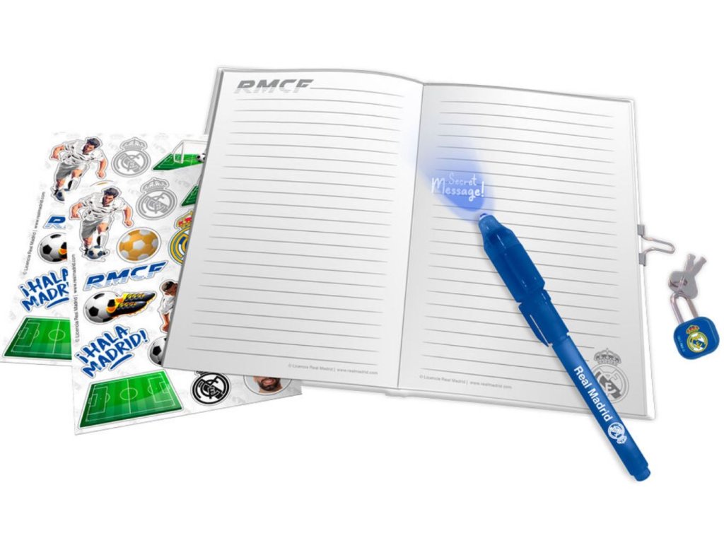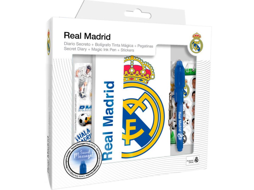 Stylová psací sada s motivem Real Madrid potěší každého fanouška tohoto slavného fotbalového klubu. Deníček na zámek je ideální pro tajné poznámky nebo zápisky z tréninku, svítící pero odhalí skryté zprávy a samolepky s fotbalovou tematikou dodají stránkám pořádný stadionový šmrnc.