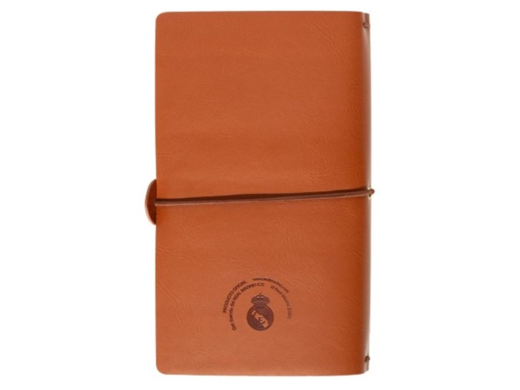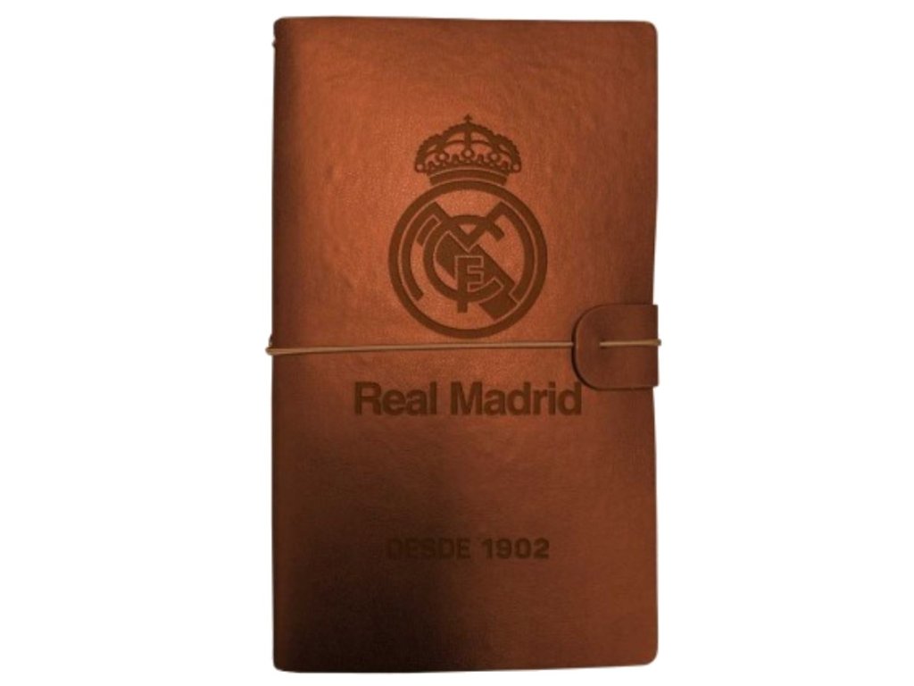 Atraktivní cestovní poznámkový zápisník v měkkém koženkovém obalu ze syntetické kůže. Na přední straně obalu je vytlačena grafika inspirovaná erbem a logem fotbalového klubu Real Madrid.