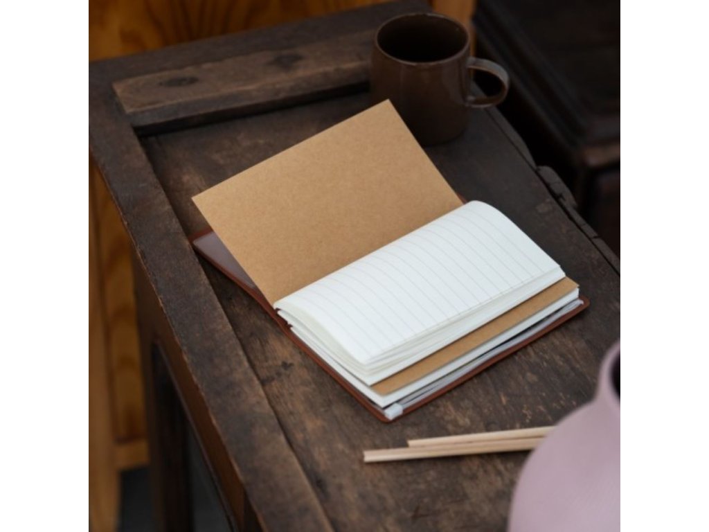 Koženkový obal stahovatelný praktickou gumou obsahuje dva samostatné a gumou uchycené poznámkové bloky v tvrdších obalových deskách. Jeden blok linkovaný, druhý blok vytečkovaný do čtverečkovaných stránek. Každý blok o 40 listech/80 stranách.
