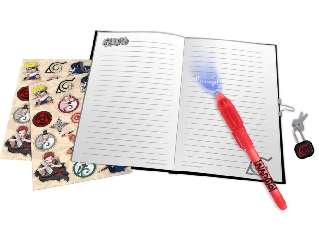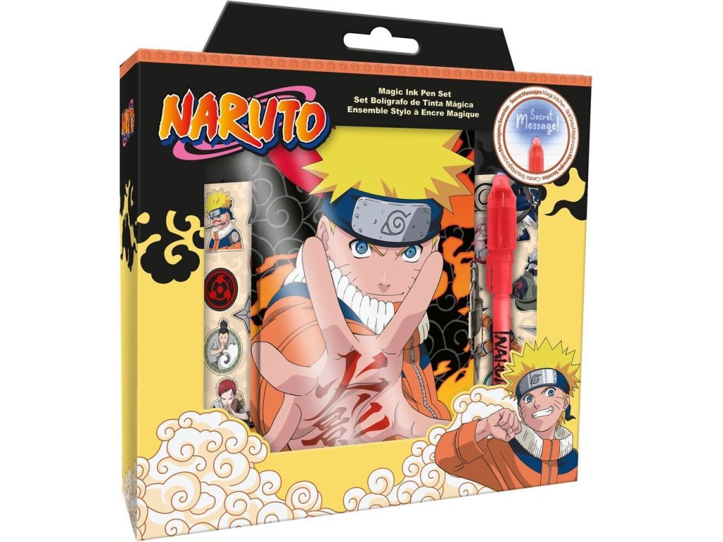 Dárkový set s poznámkovým linkovaným blokem velikosti A5 a magickou propiskou a samolepkami s grafikou mangy Naruto. Set je zabalen v dárkové krabici a je vhodným dárkem pro všechny menší i větší fanoušky. Diář s motivem postavy Naruta je mimořádně atraktivním dárkem pro vaše dítě. Takový deník je ideálním místem pro zapisování dětských snů a tajných tajemství, protože propiska nejde vidět, ovšem po nasvícení ultrafialovým světlem je všemu jinak.