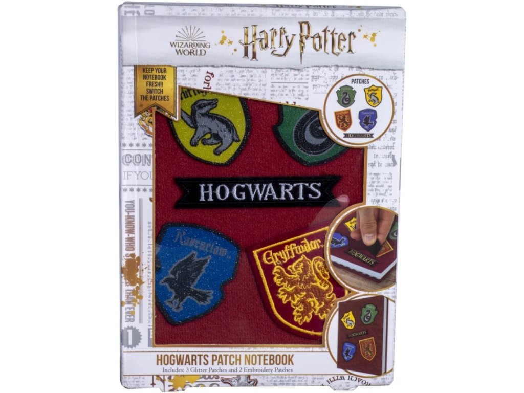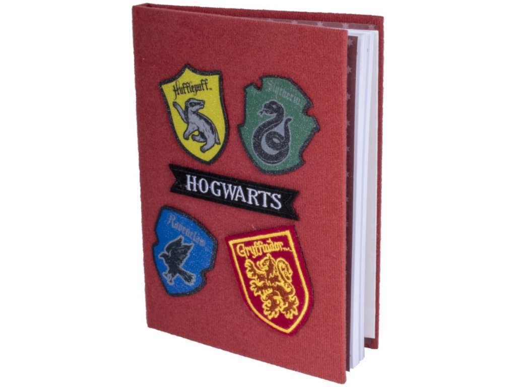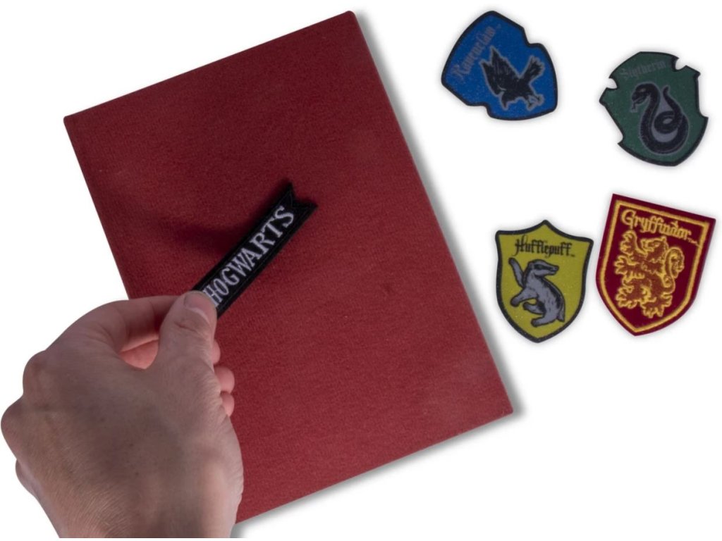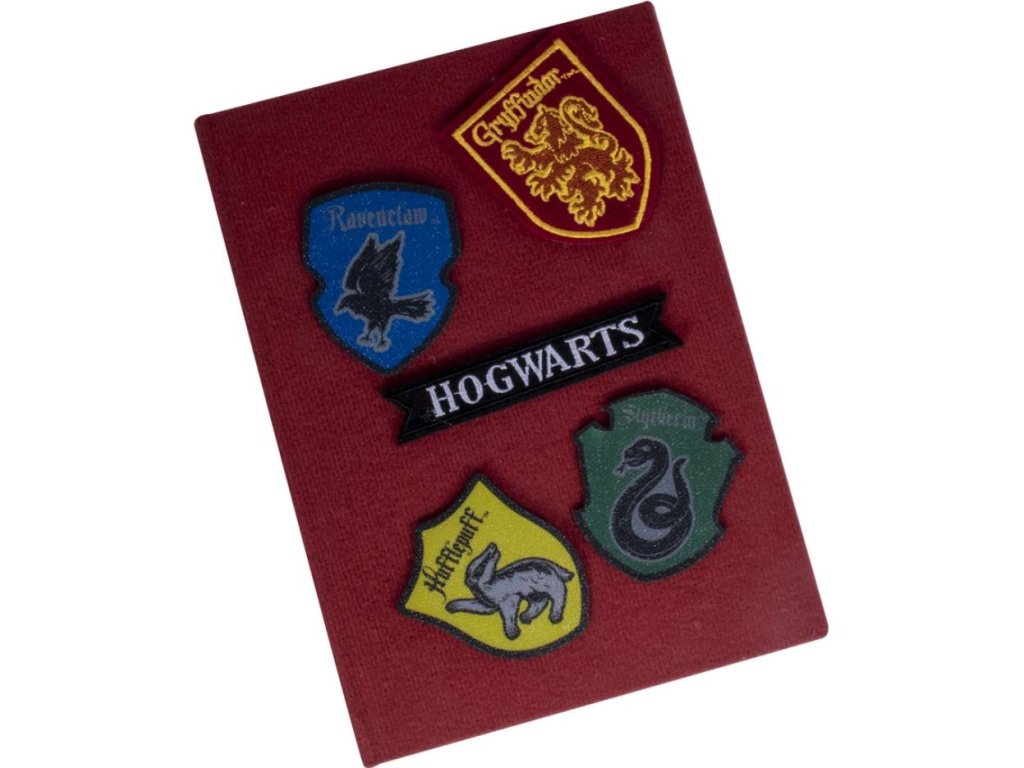 Zápisník s tvrdými deskami s motivem Hogwarts houses (Bradavice). Tento blok má plstěný obal s 5 záplatami.