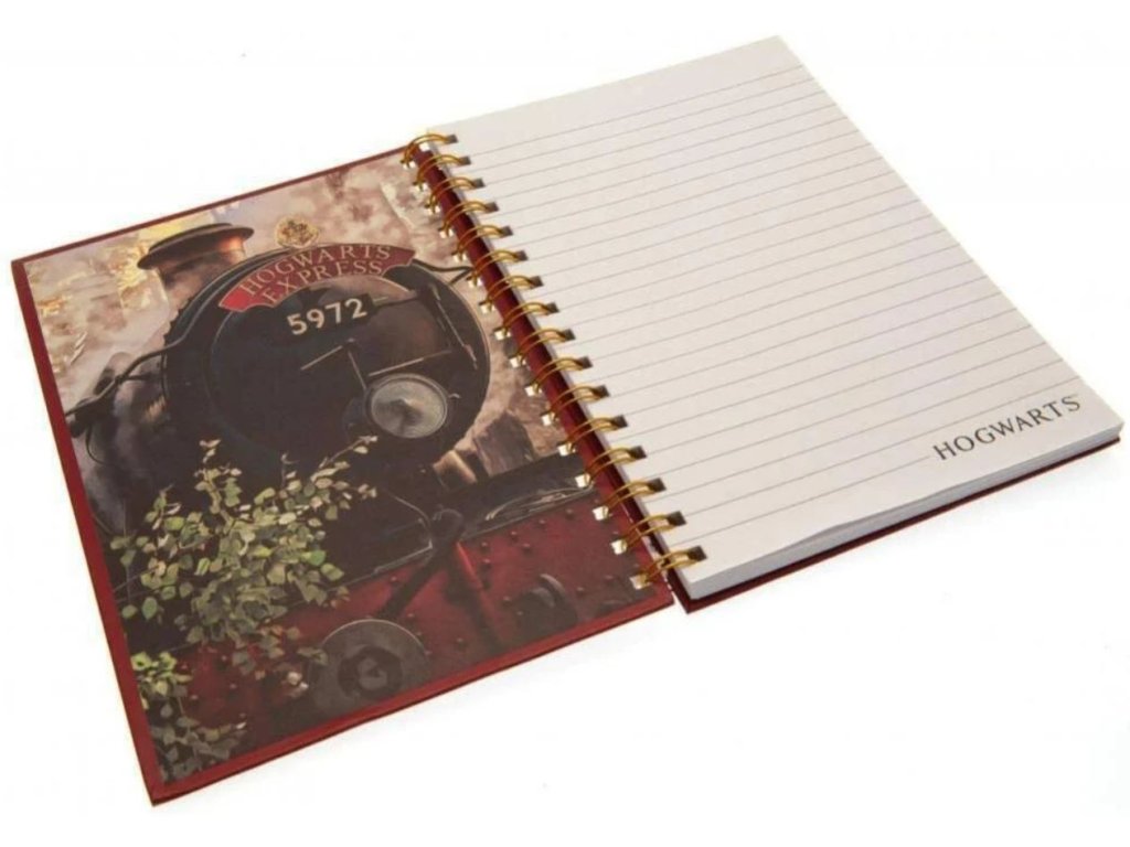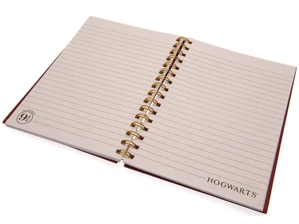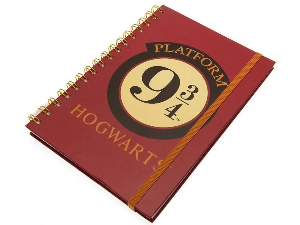 Červený zápisník ve formatu A5 s kroužkovou vazbou a červenou gumičkou stahující celý zápisník s tvrdými deskami. Na přední straně je vyzobraný znak nástupiště 9 a 3/4. Blok má 80 listů, linkovaný.