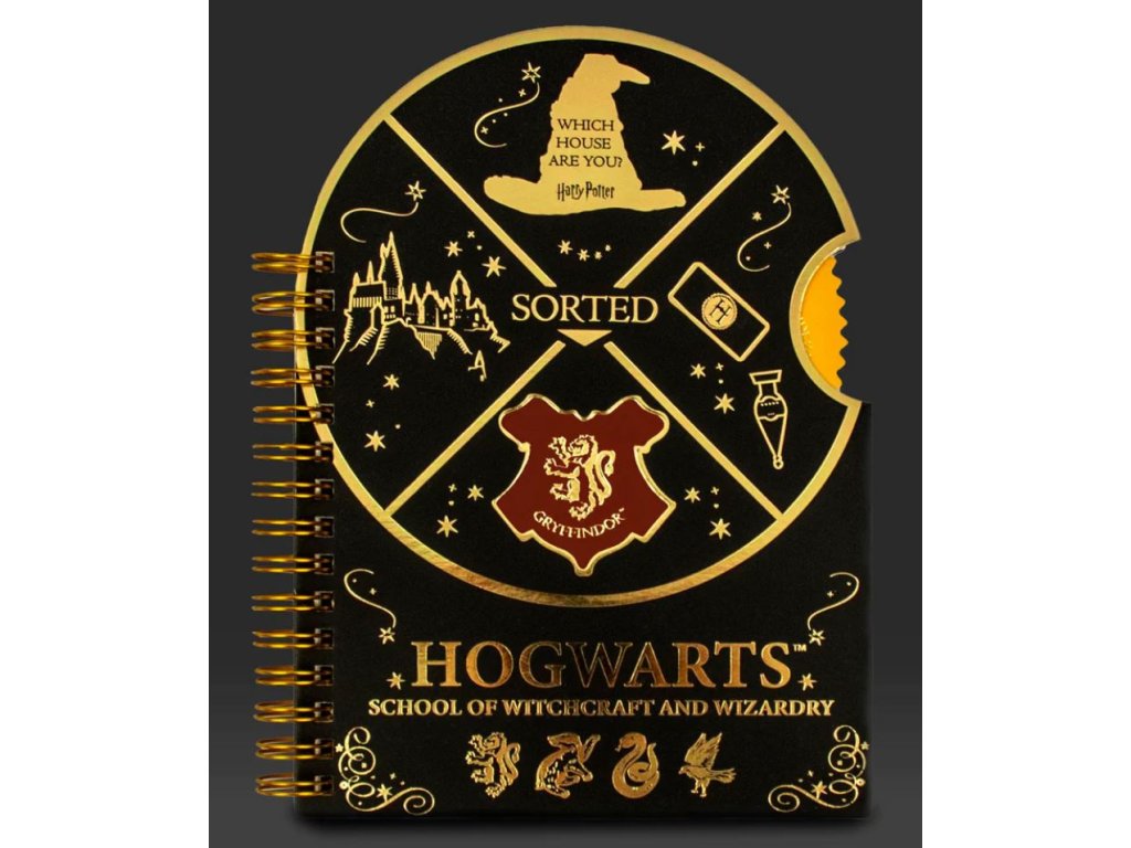 Zápisník velikosti A5 s funkcí otočného kolečka v kroužkové vazbě s grafikou Bradavického znaku z populární filmové a knižní série Harry Potter. Blok má 40 linkovaných listů.