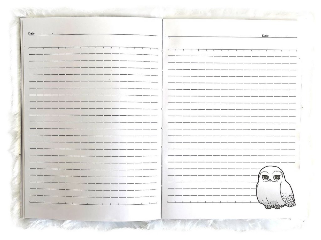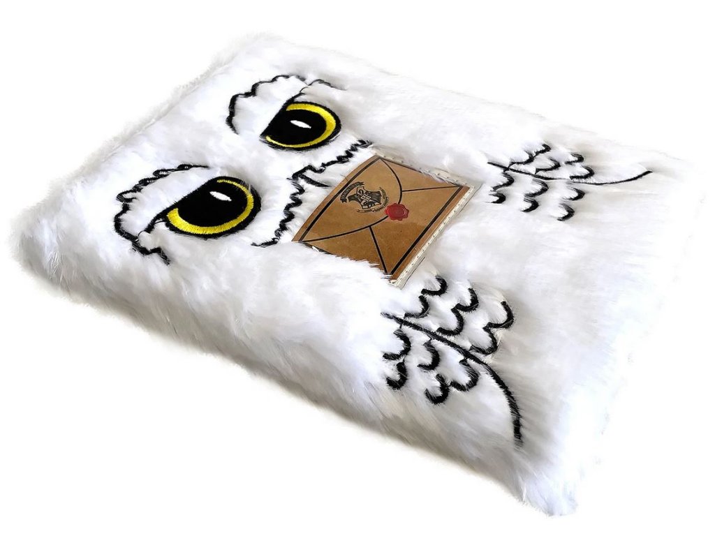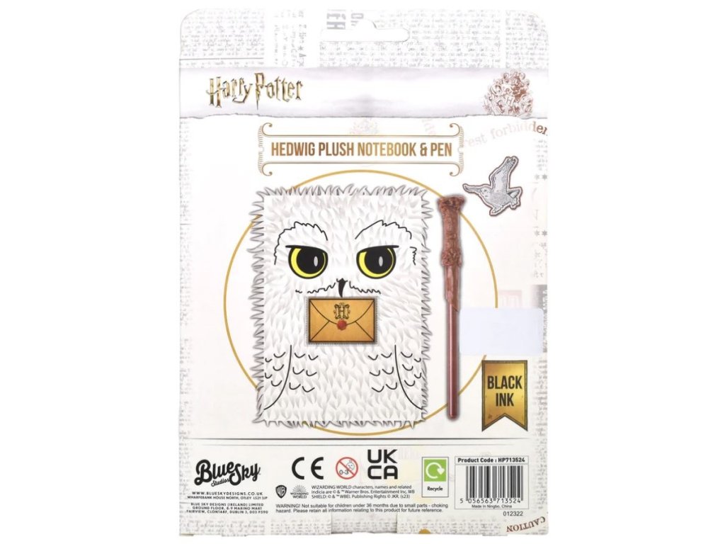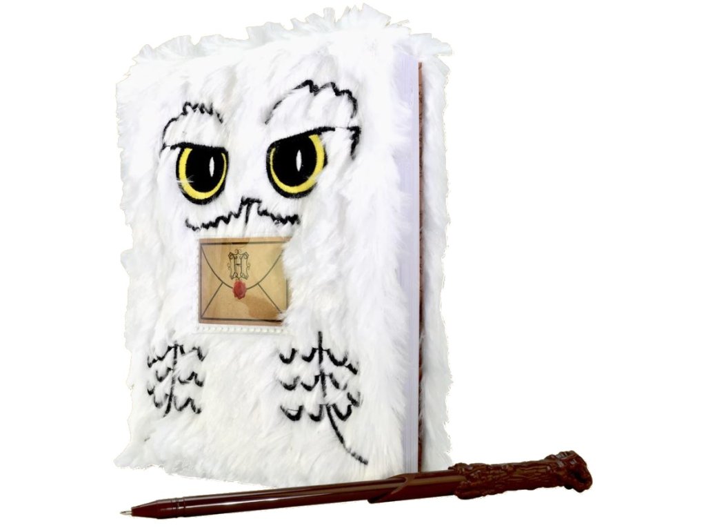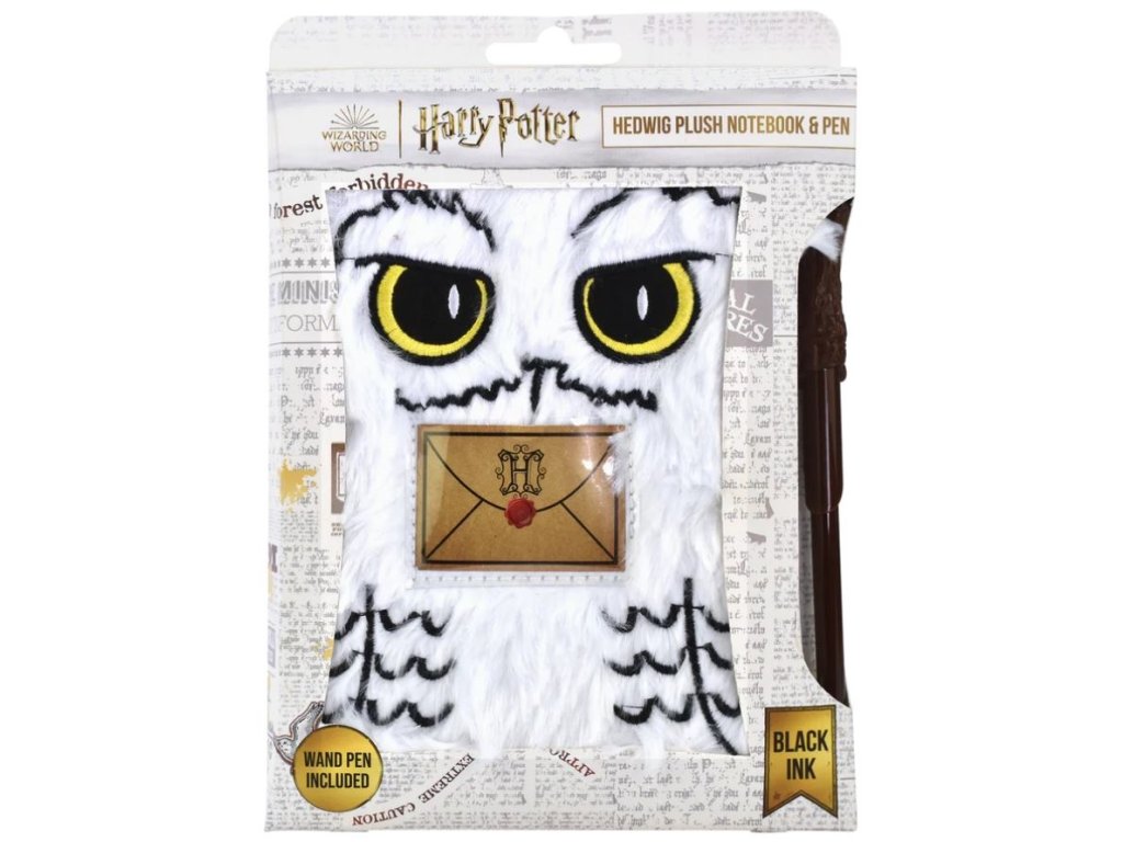 Plyšový sešit A5 s Hedvičiným obličejem a obálkou. Uvnitř linkovaný papír s logem Hedwig. Hůlkové pero "Harry" je součástí balení.