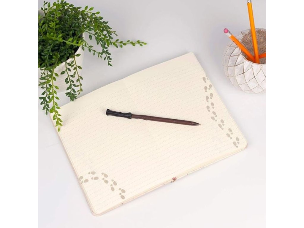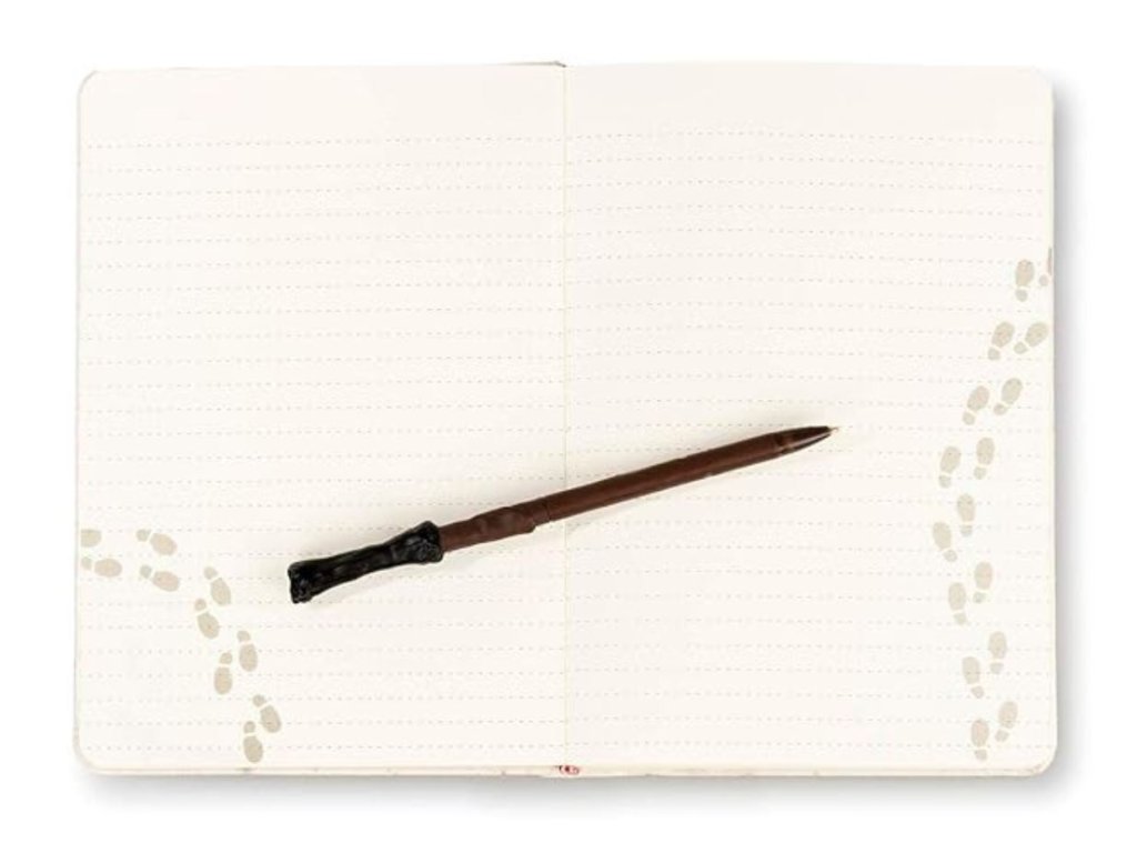 Zápisník ve formátu A5 v pevné vazbě s propiskou, vyvedený s grafikou siluety školy čar a kouzel v Bradavicích, které jsou vyznačené na Pobertově pláku. Blok má personalizovaný vnitřek, lepenou vazbu, obsahuje 96 linkovaných listů (192 stran) gramáže 100 g/m2. Propiska dodávána k bloku je vyvedená jako kouzelnická hůlka.