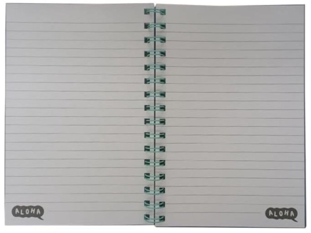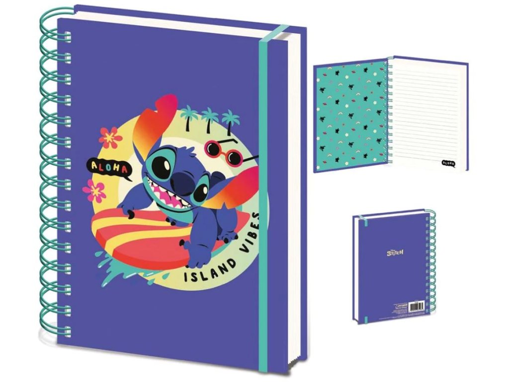 Zápisník ve formátu A5 s linkovanými listy, drátěnou vazbou, zavíráním na gumičku a pevnou vazbou s personalizovanými vnějšími a vnitřními obálkami do grafiky Stitche s dovolenkovou náladou.