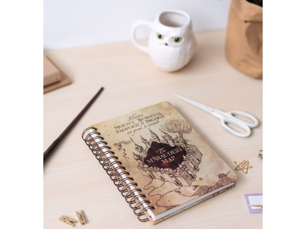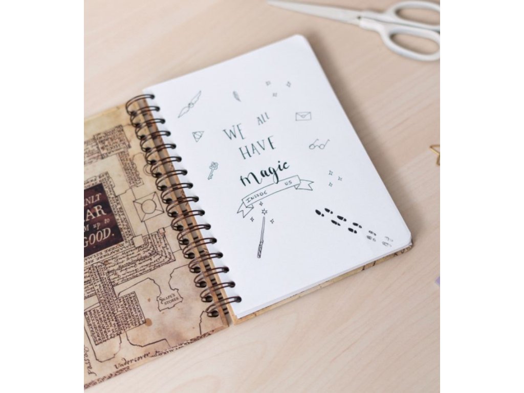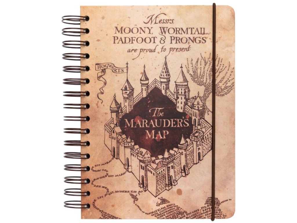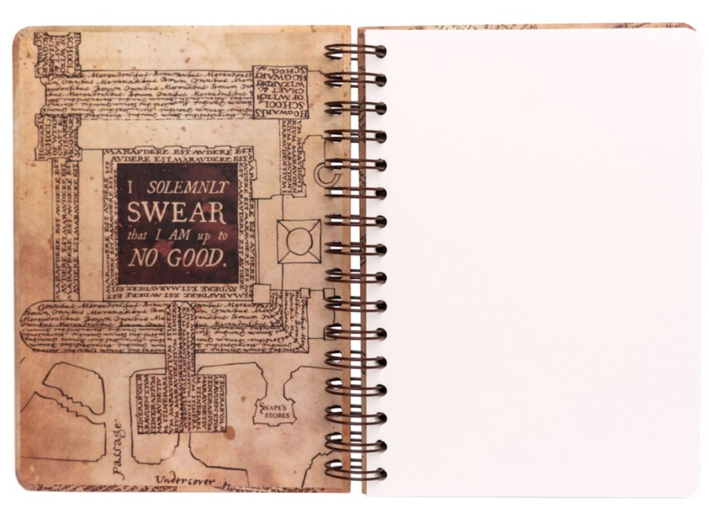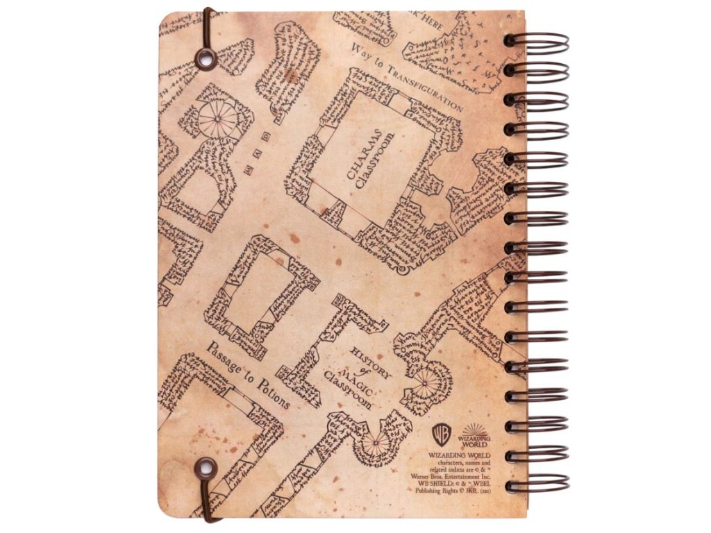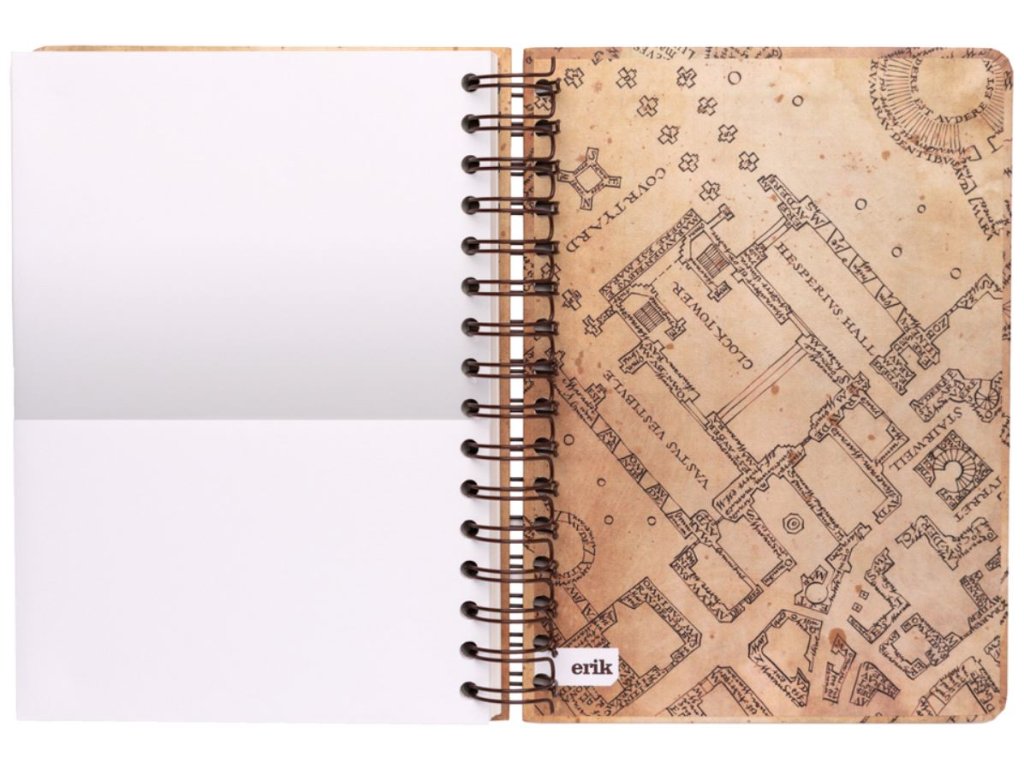 Blok ve formátu A5 v kroužkové vazbě s nelinkovaným papírem a 90 stranami inspirovaný Pobertovým plánkem (Marauders Map) z kouzelnické ságy Harry Potter.