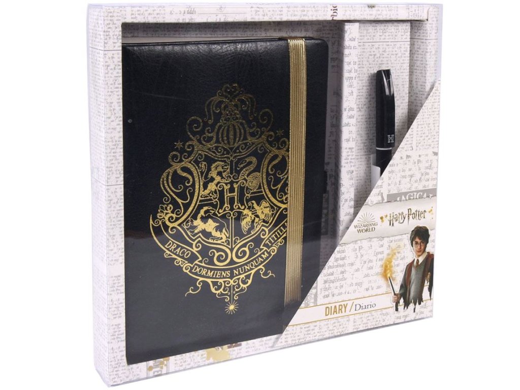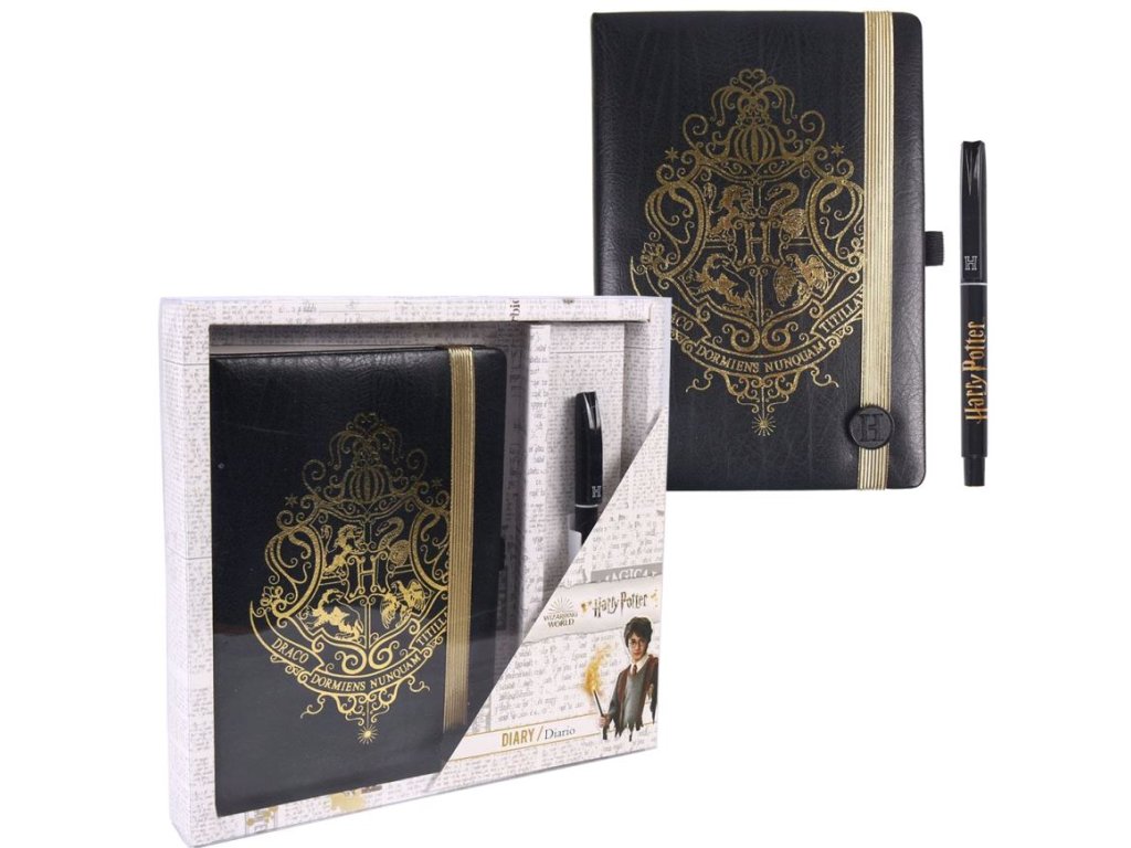 Oficiální zápisník v setu s propiskou z katalogu kancelářských a dárkových produktů s grafikou, fotografiemi a licencí populární knižní a filmové sci-fi ságy Harry Potter.