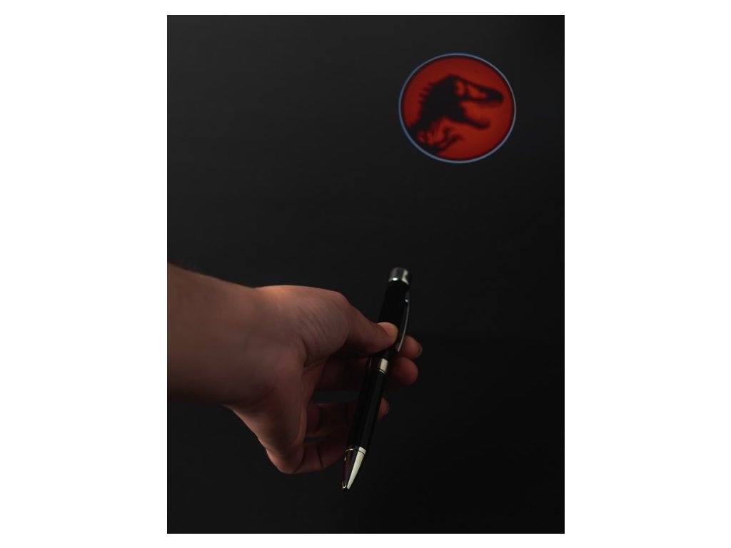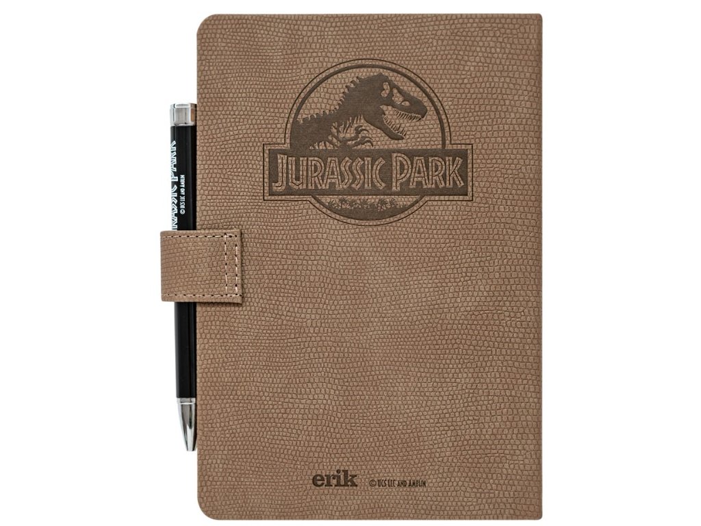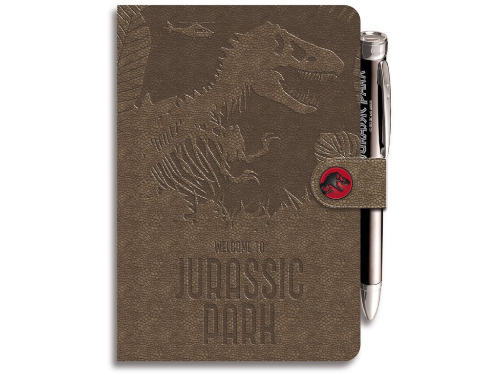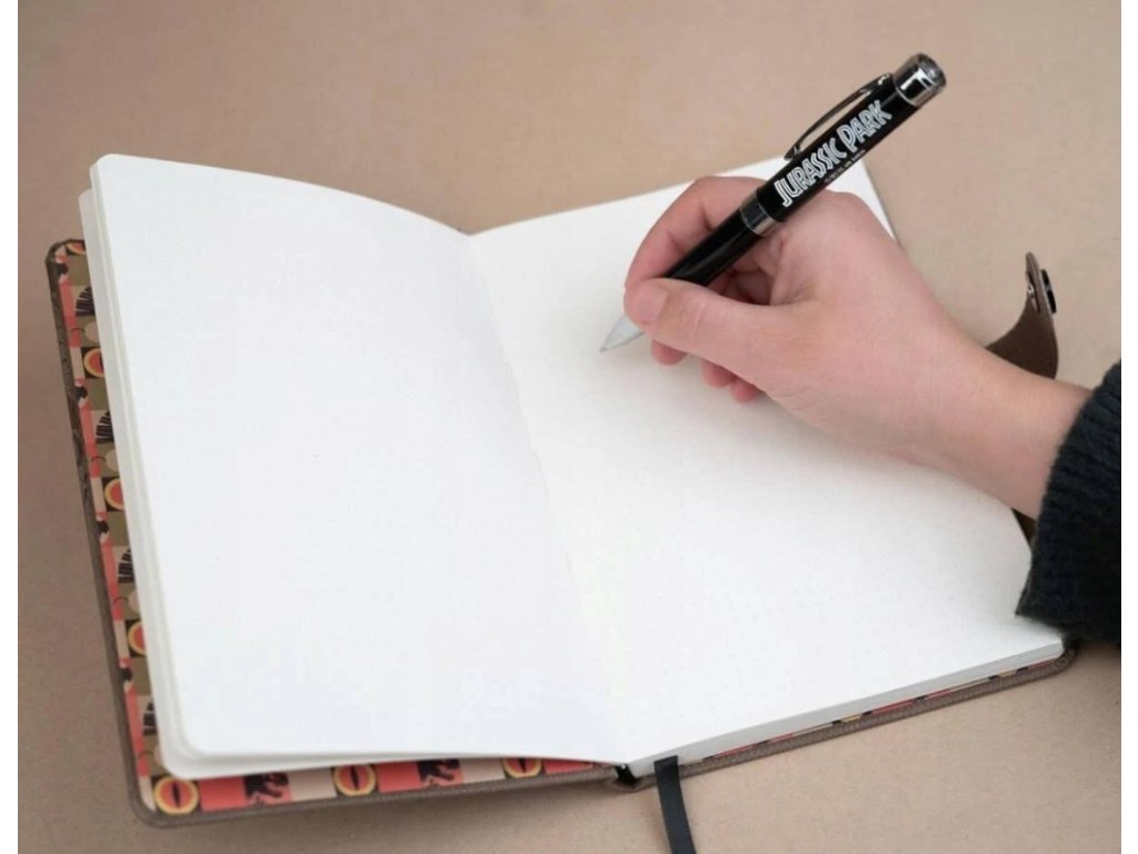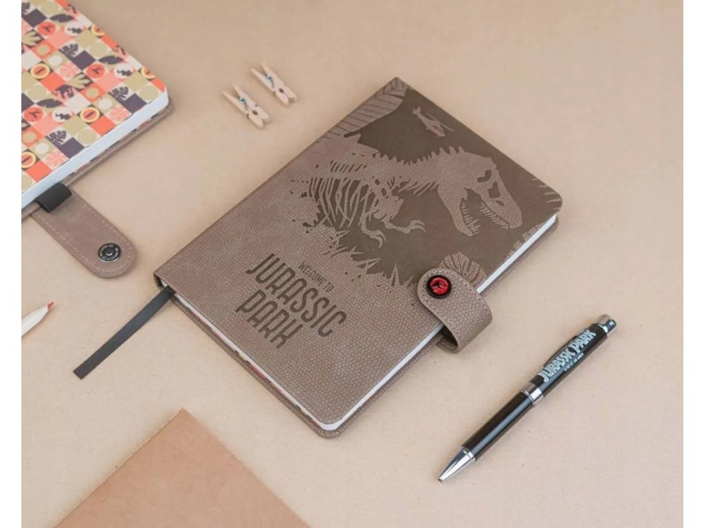Blok s tvrdou vazbou a logem z filmu Jurský park disponuje propiskou, která promítá červené logo.