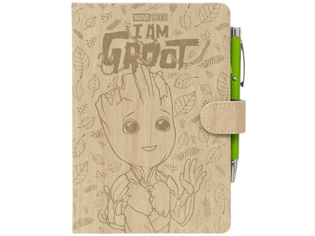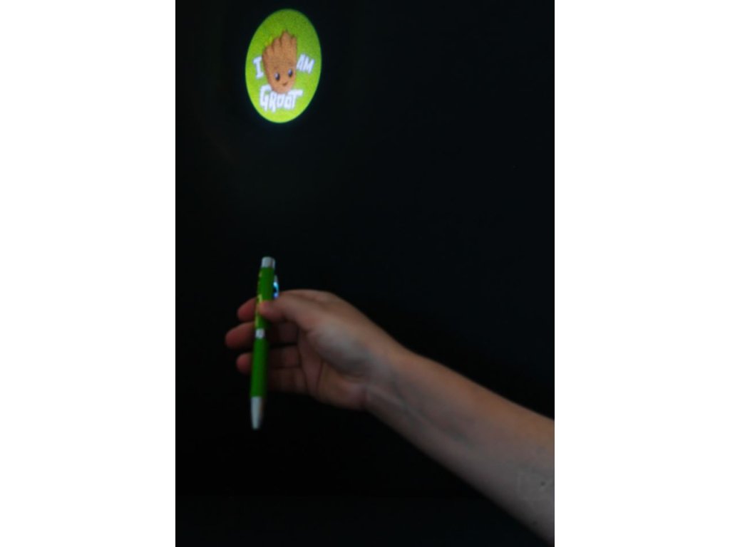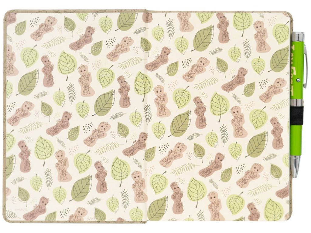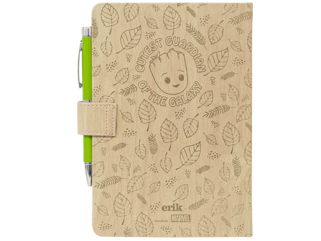 Zápisník ve formátu A5 s 90 nelinkovanými listy (180 stran o tloušťce 100 g) se svítící propiskou promítající postavičku Groota z filmu Guardians of the Galaxy.