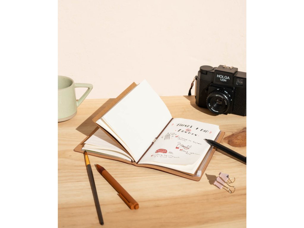 Atraktivní cestovní poznámkový zápisník v měkkém hnědém koženkovém obalu ze syntetické kůže.