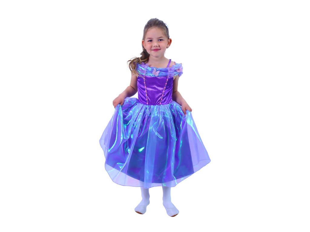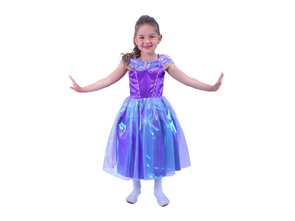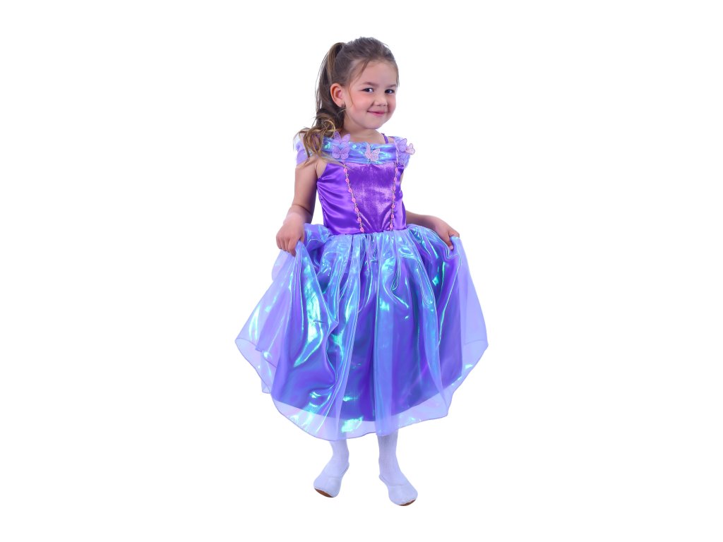 Okouzlující karnevalový kostým s motivem princezny ve fialové barvě, horní část je zdobena stylovými motýlky. Kostým je ve velikosti M a je určen pro holčičky ve věkovém rozmezí 6-8 let (116-128 cm).