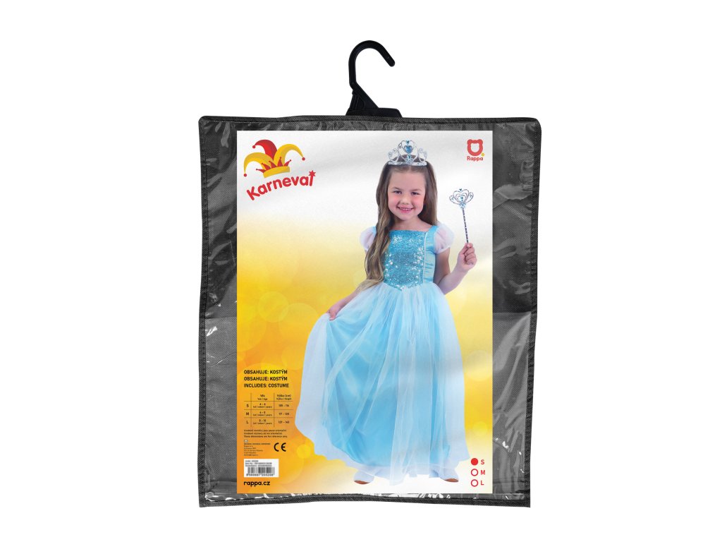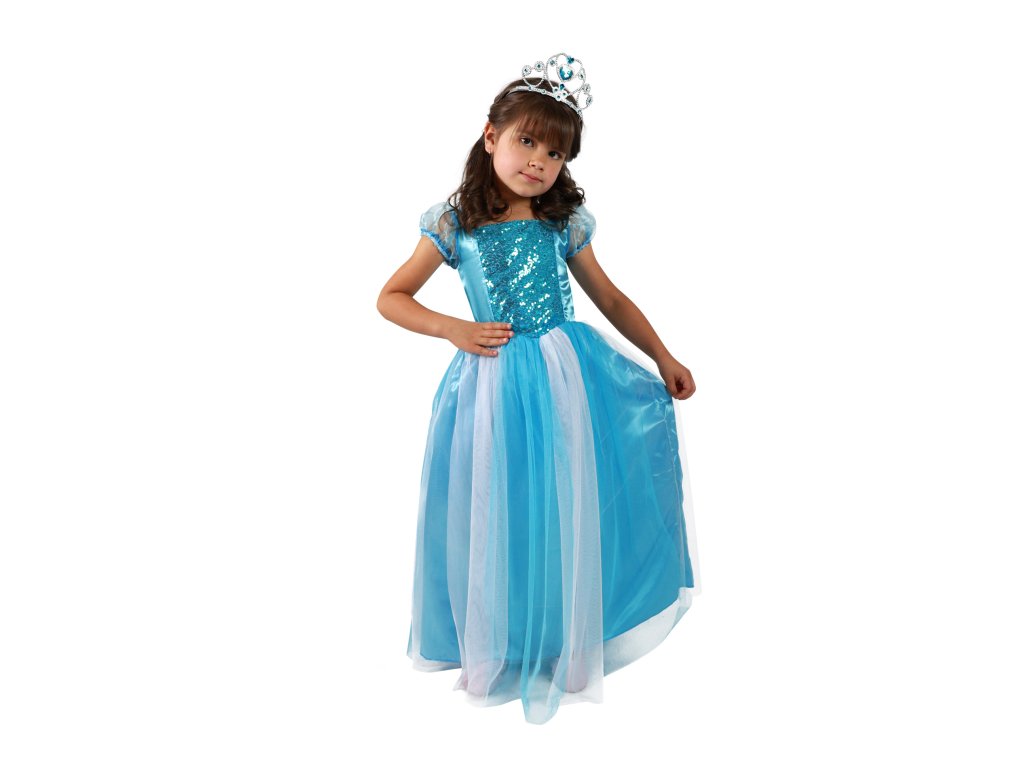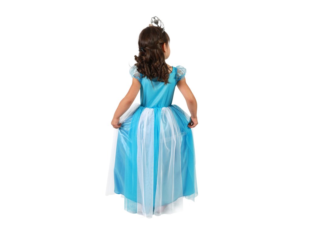 Úchvatný dívčí kostým pro princezny! Kostýmek modré barvy je kombinován s bílým tylem a v horní části dekorován modrými flitry. Kostým princezny ve velikosti S je určen pro holčičky ve věkovém rozmezí 4-6 let (110-116 cm).