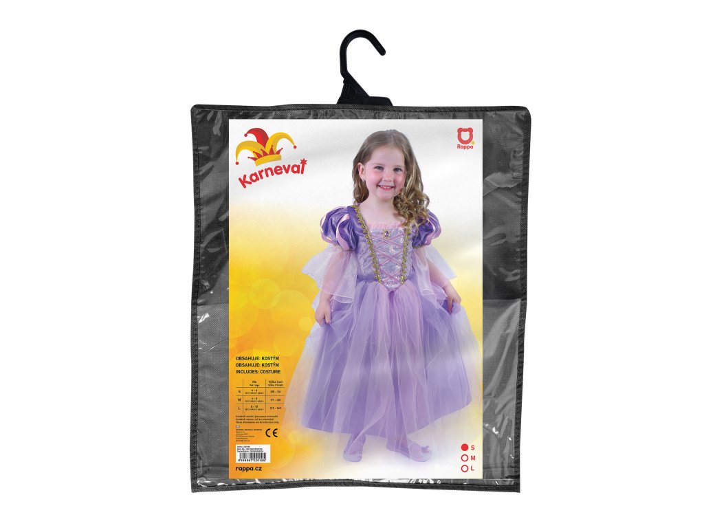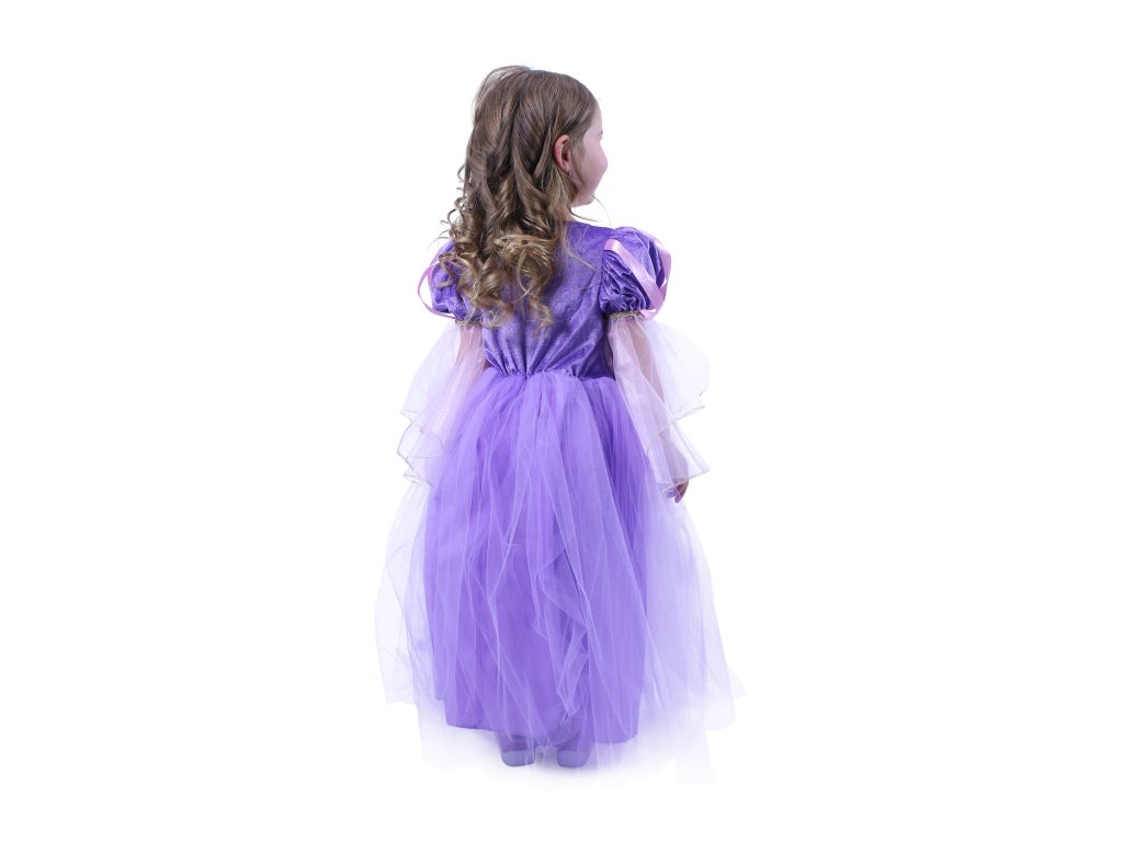 Úchvatný dívčí kostým pro princezny! Kostým princezny ve velikosti S je určen pro holčičky ve věkovém rozmezí 4-6 let (105-116 cm). Kostýmek je ušit v růžovo-fialkové barvě a zdoben zlatým lemováním.