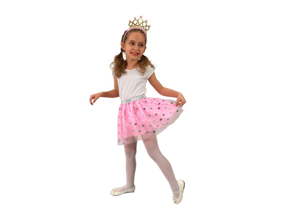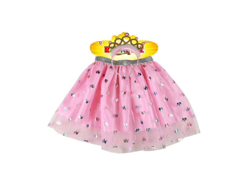 Senzační tutu sukýnka pro všechny malé parádnice ve věkovém rozmezí 3-7 let (104-130 cm). Nadýchaná tylová suknička růžové barvy s potiskem korunek má délku cca 30 cm. Součástí setu je čelenka s korunkou, která sukýnku skvěle doplňuje.
