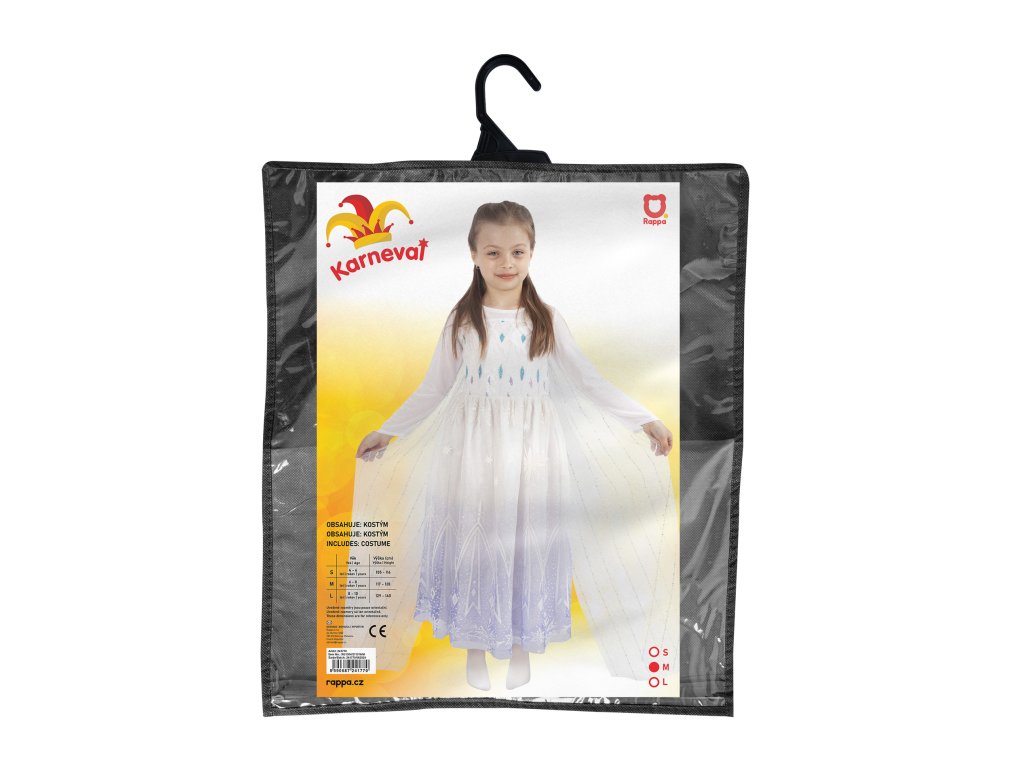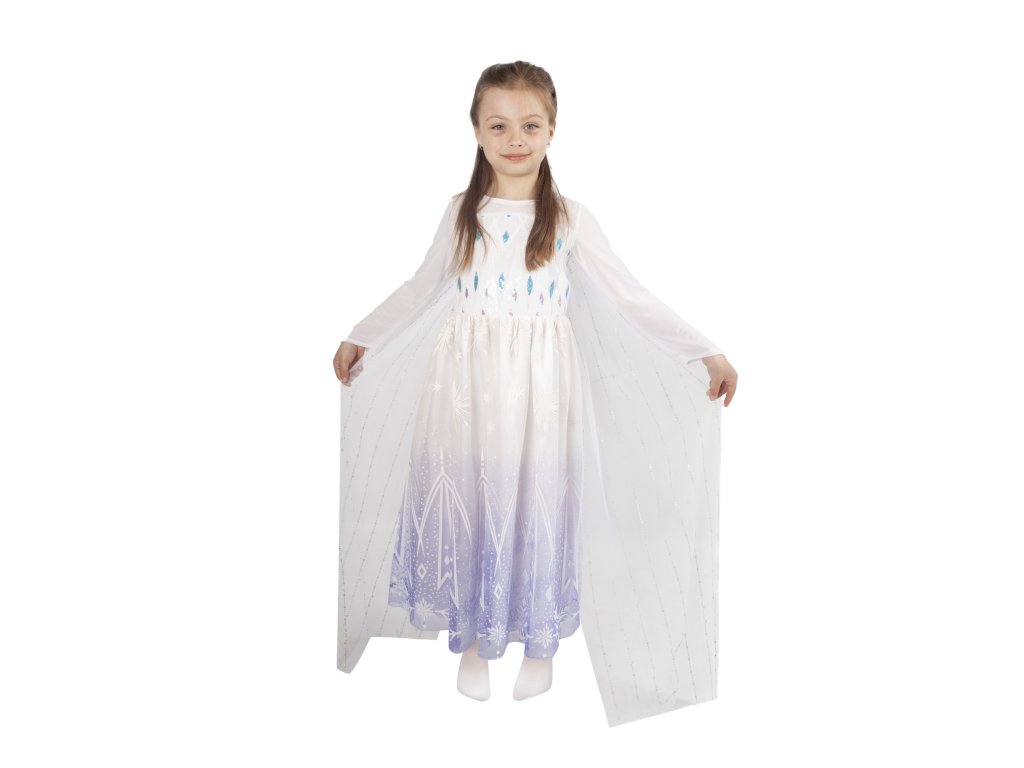 Úchvatný dívčí kostým pro všechny zimní princezny! Dlouhé šaty v bílé barvě jsou v horní části zdobené flitry, od pasu dolů je bílo-fialová tylová sukně zdobena potiskem. Součástí šatů je také vlečka dekorována flitry. Kostým ve velikosti M je určen pro holčičky ve věkovém rozmezí 6-8 let (116-128 cm).