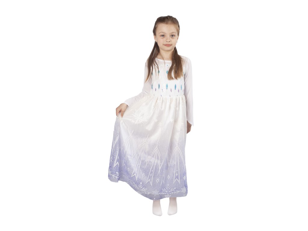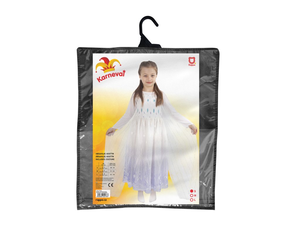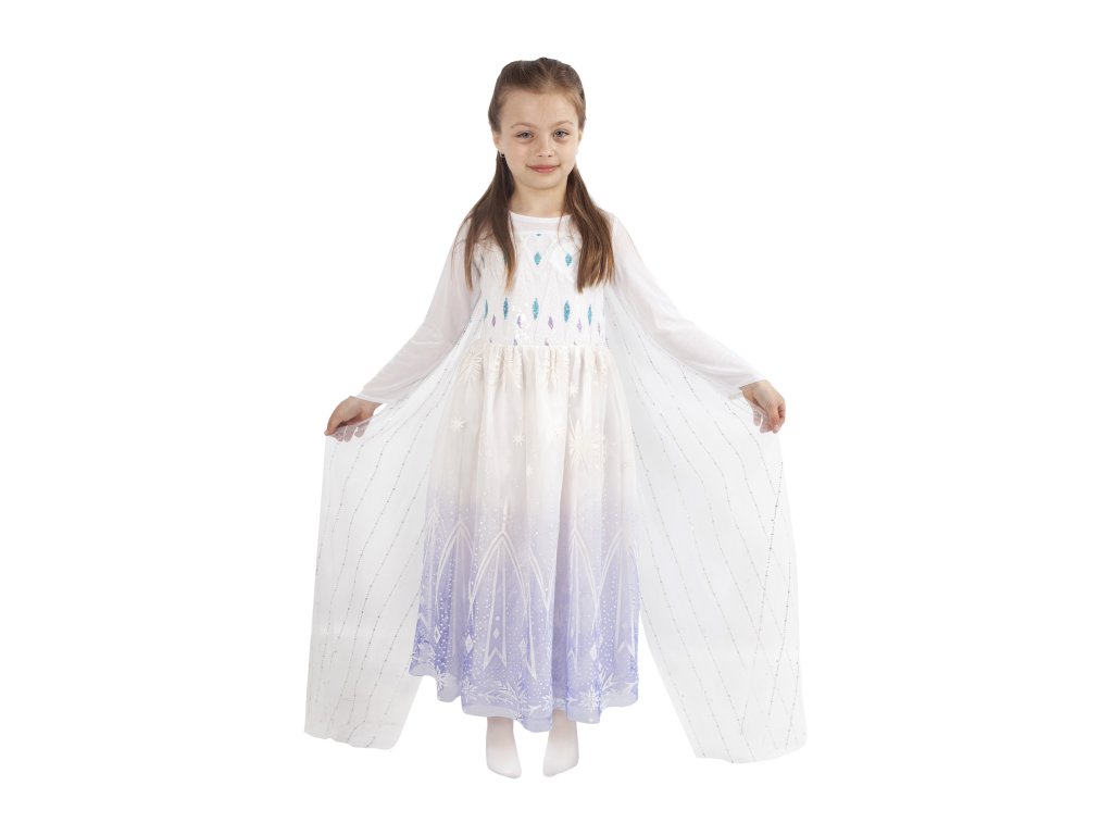 Úchvatný dívčí kostým pro všechny zimní princezny! Dlouhé šaty v bílé barvě jsou v horní části zdobené flitry, od pasu dolů je bílo-fialová tylová sukně zdobena potiskem. Součástí šatů je také vlečka dekorována flitry. Kostým ve velikosti M je určen pro holčičky ve věkovém rozmezí 6-8 let (116-128 cm).