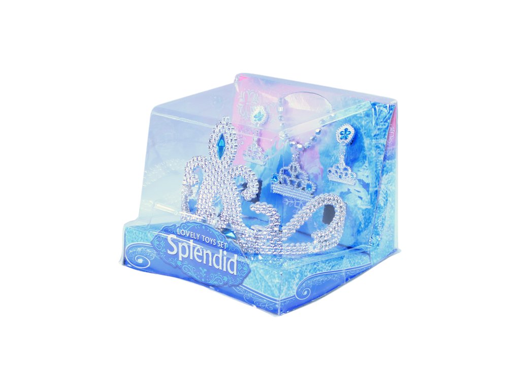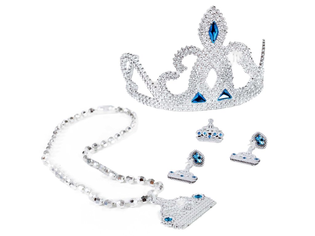 Krásná korunka s náušnicemi, náhrdelníkem a prstýnkem pro všechny princezny. Doplňky jsou zdobeny modrými prvky. Perfektní sada ke kostýmu! Doporučeno pro děvčata od 3 let.