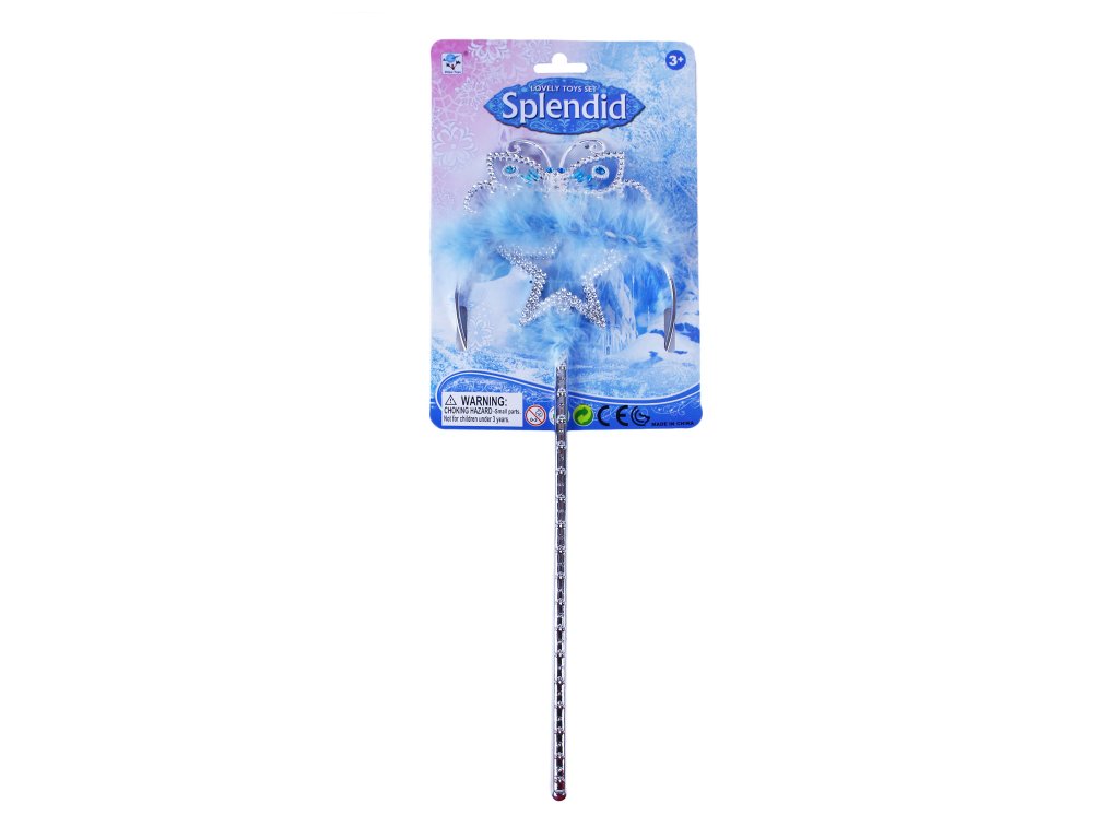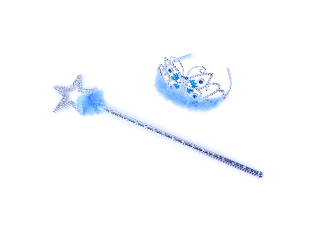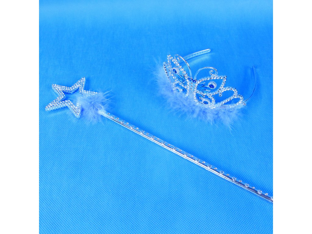 Exkluzivní sada pro zimní princezny! Tato stylová souprava stříbrné barvy obsahuje oslnivou korunku s modrými kamínky a žezlo. Vše je dekorováno ozdobným peřím modré barvy. Obohať svůj kostým zimní princezny o tyto nádherné doplňky!