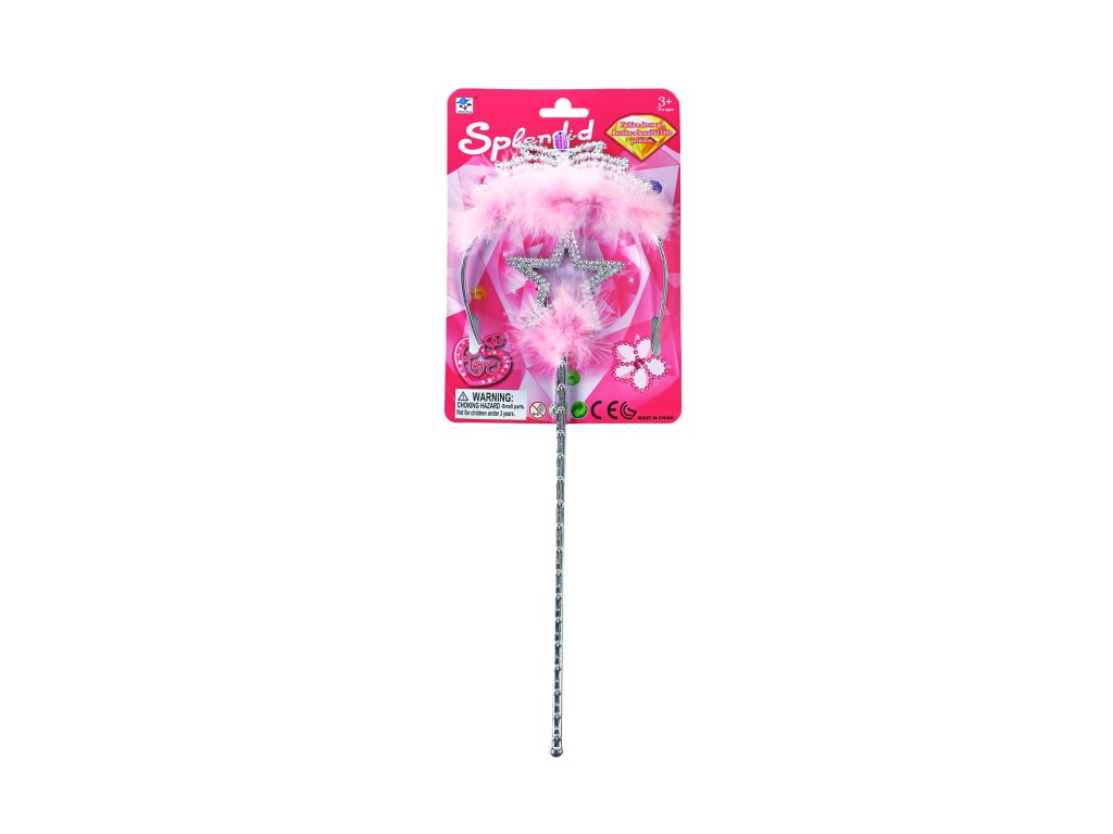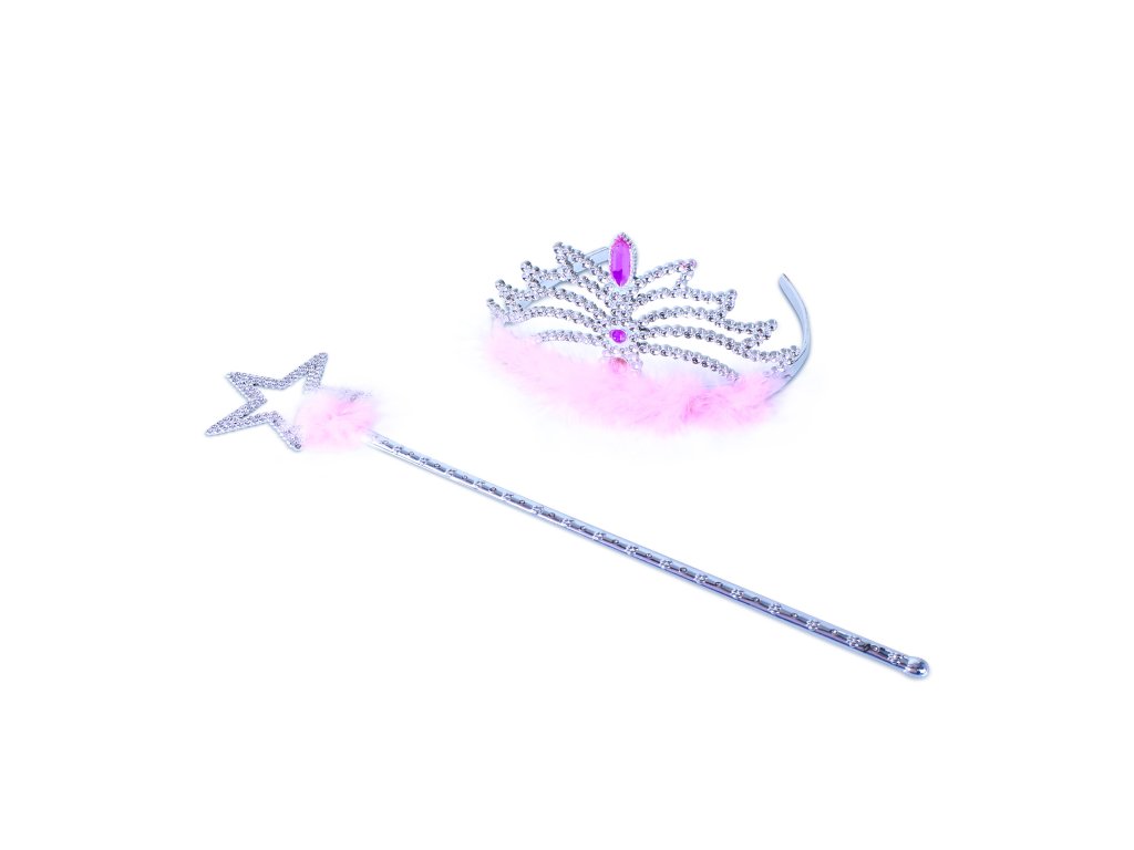 Exkluzivní sada pro princezny! Tato stylová souprava stříbrné barvy obsahuje oslnivou korunku s barevnými kamínky a žezlo. Vše je dekorováno ozdobným peřím růžové barvy. Obohať svůj kostým princezny o tyto nádherné doplňky!