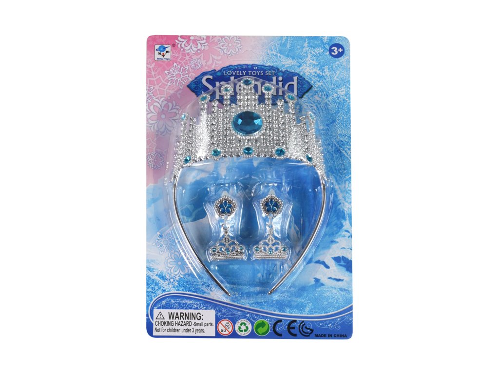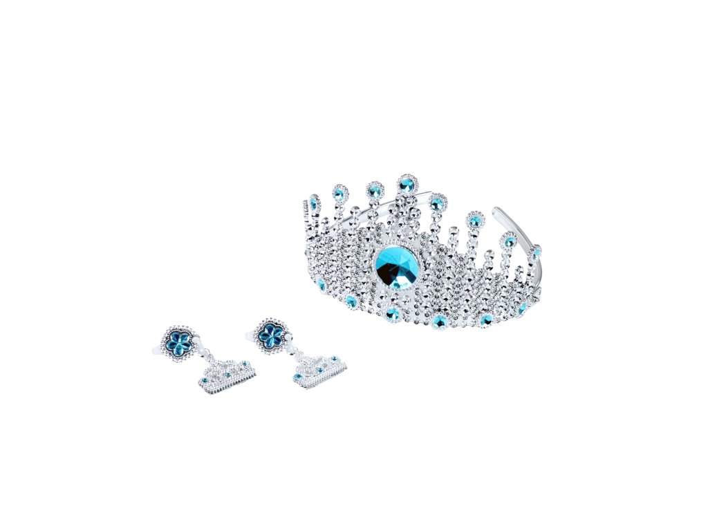Krásná korunka pro sněhové princezny s náušnicemi. Vše je zdobeno modrými prvky. Perfektní sada ke kostýmu! Doporučeno pro děvčata od 3 let.