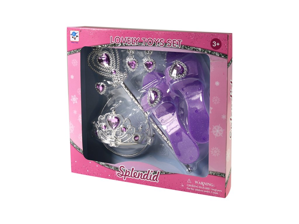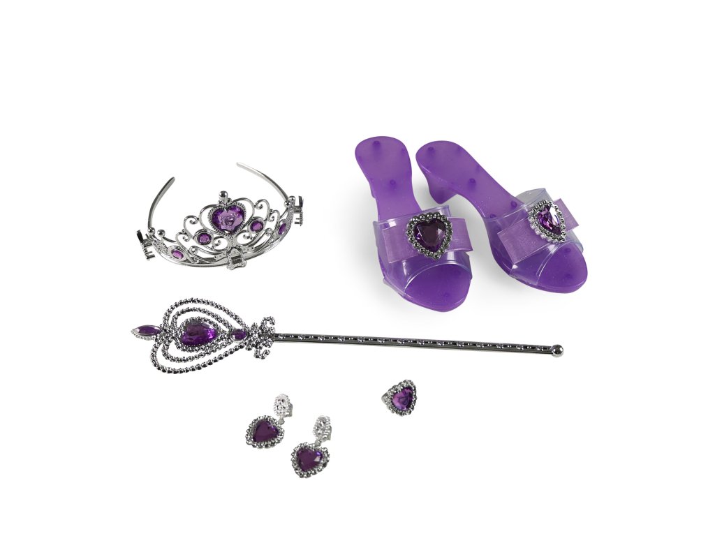 Proměň se v opravdovou princeznu! Tato krásná sada obsahuje vše, co malá parádnice potřebuje ke svým pohádkovým dobrodružstvím. Elegantní střevíčky, korunku, náušnice, prstýnek a kouzelnou hůlku. Díky stříbrno-fialové barevné kombinaci působí celý set velmi slavnostně a okouzlujícím dojmem. Hodí se nejen na hraní doma, ale i na karnevaly, narozeninové oslavy či dětské párty.