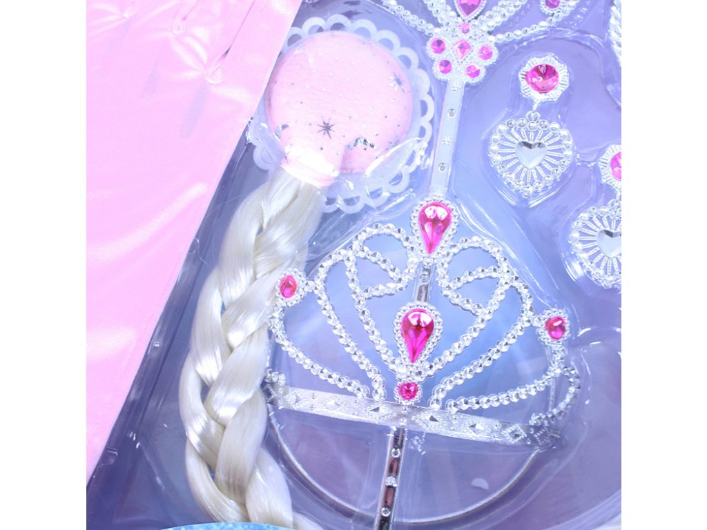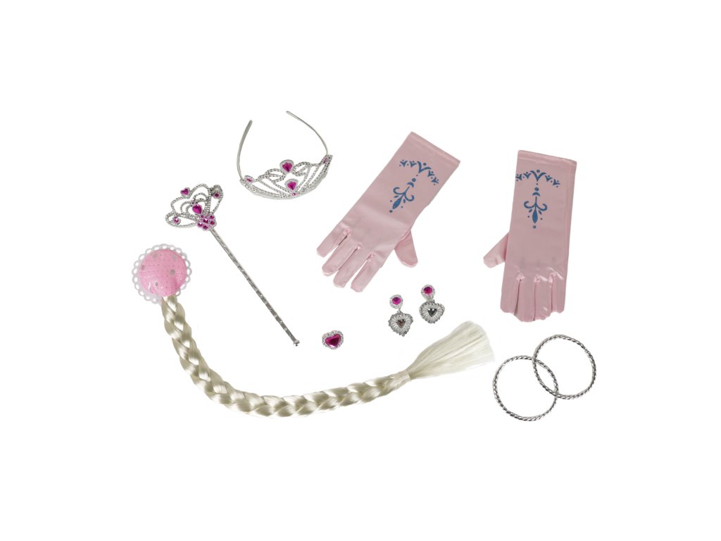 Exkluzivní sada pro všechny malé princezny! Krásná korunka s náušnicemi, prstýnky, hůlkou, náramky a rukavicemi. Doplňky jsou zdobeny růžovými prvky. Součástí je dlouhý cop v blond provedení. Perfektní sada ke kostýmu! Doporučeno pro děvčata od 3 let.