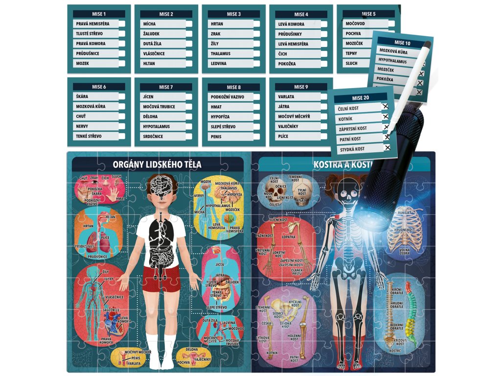 Obsah balení: 84 dílkové puzzle, 10 oboustranných karet misí, 1 mazatelné pero, 1 UV baterka (vyžadující 3 AAA baterie, které nejsou vložené)