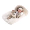 5dílný obleček s oboustranným polštářem využitelným jako podložka pro panenku miminko NEW BORN Llorens velikosti 40-42 cm. Vyrobeno ručně ve Španělsku, baleno v igelitovém obalu s plastovým ramínkem. Doporučený věk od 3 let.