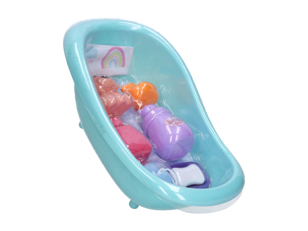 Vanička s doplňky. Velikost vaničky 38 cm. Obsah balení - vanička, medvídek, kachnička, 2x lahvička, žínka, mýdlo.