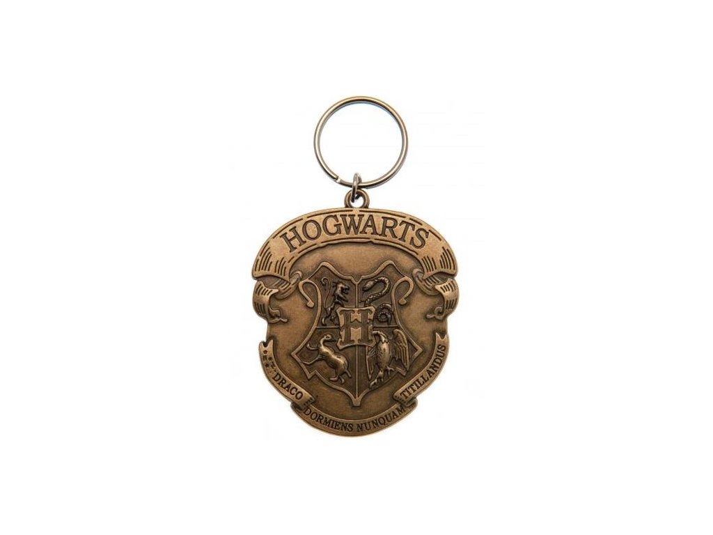 Přívěsek na klíče inspirovaný logem školy čar a kouzel v Bradavicích.