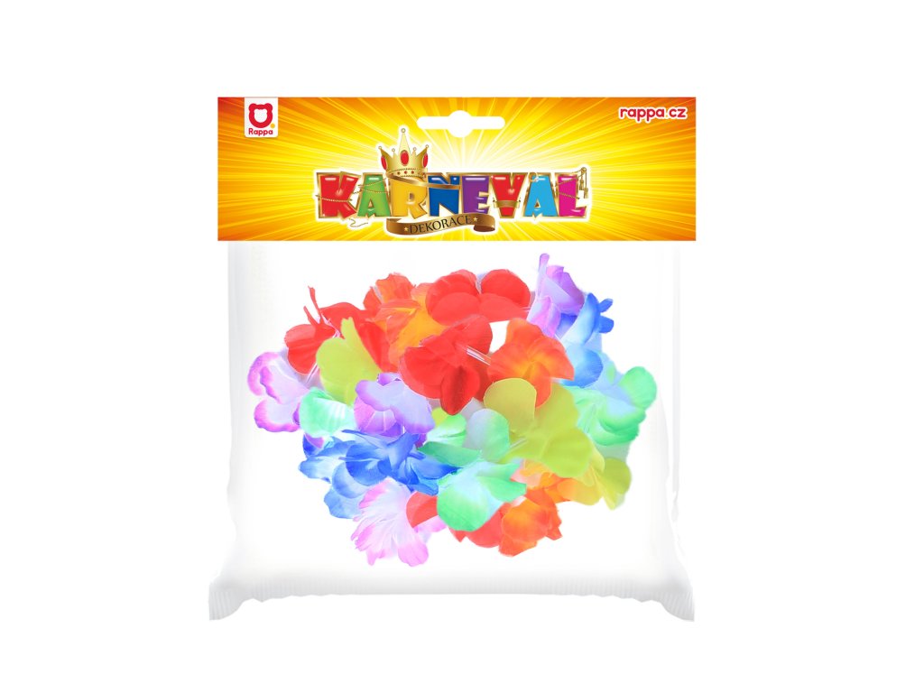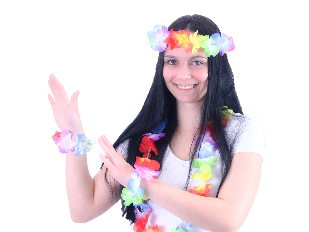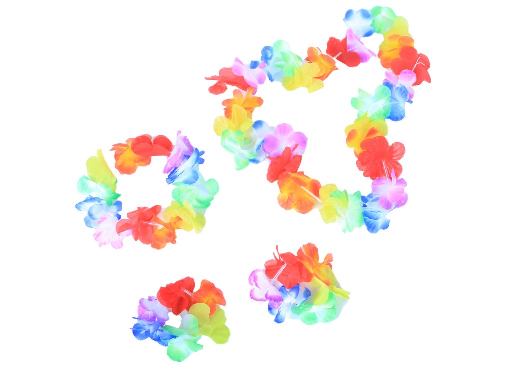Nepřehlédnutelná sada na karneval ve stylu "Havaj" je parádním doplňkem ke kostýmu. Tento barevný set obsahuje 2 náramky, 1 náhrdelník a 1 čelenku. Vše je zdobeno okvětními lístky a nádhernou kyticí. Senzace!