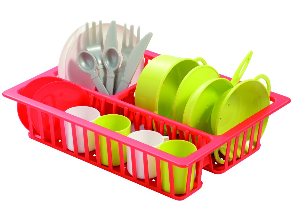 Odkapávač se sadou nádobí obsahuje talířky, příbory, šálky a kuchyňské nádobí. Rozměry odkapávače: 25x185x9,5 cm. Vše plastové.